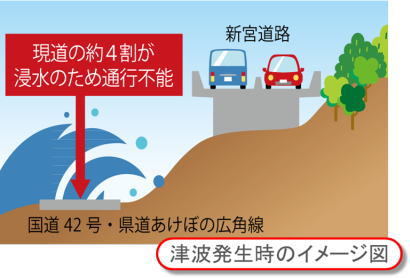 新宮道路、新宮紀宝道路の本線部は、南海トラフ地震の発生により予測される最大津波高より高い位置に計画されており、災害時の緊急ネットワークや一時的な避難場所として市民の安全と安心の確保を図ります。