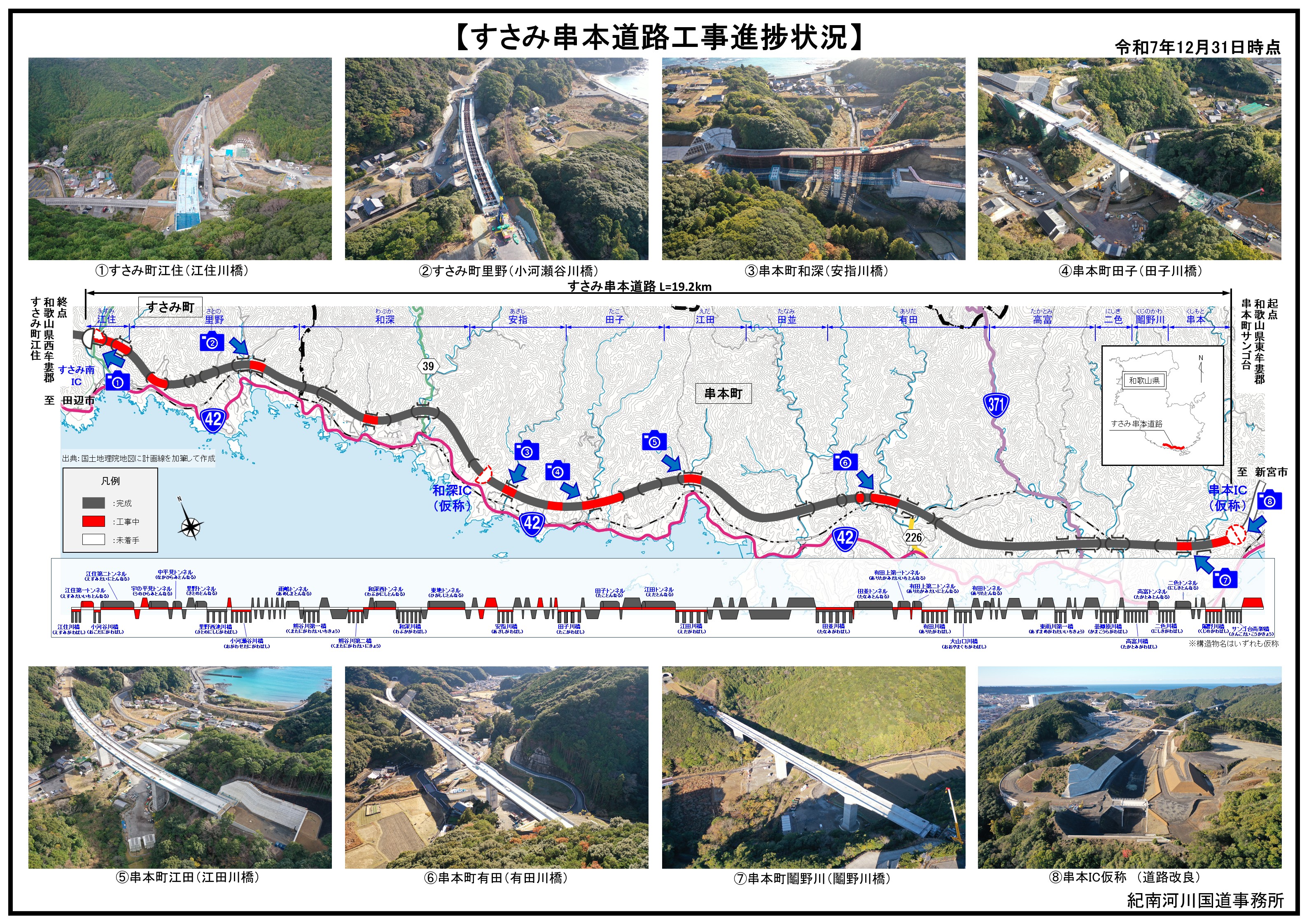すさみ串本道路は、国道42号の和歌山県東牟婁郡串本町から西牟婁郡すさみ町間における、異常気象時通行規制区間の解消、防災・災害時の代替路確保等を主な目的としています。