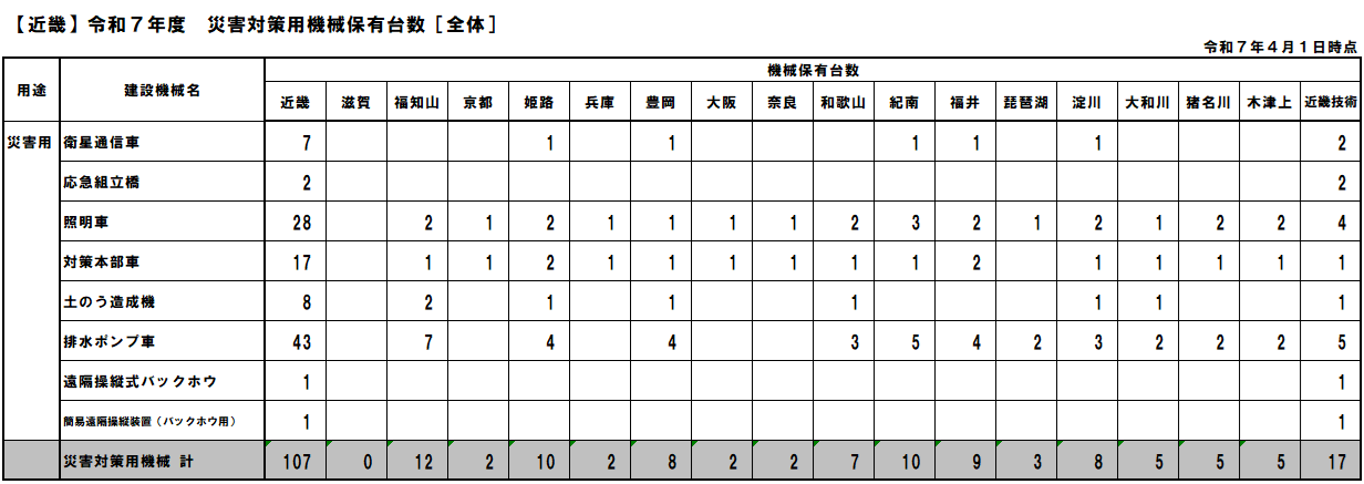 台風、集中豪雨、地震などの災害は、私たちの暮らしと隣り合わせ。近畿地方整備局近畿技術事務所は、緊急の災害発生に対応するためのさまざまな災害対策用機械を保有しています。