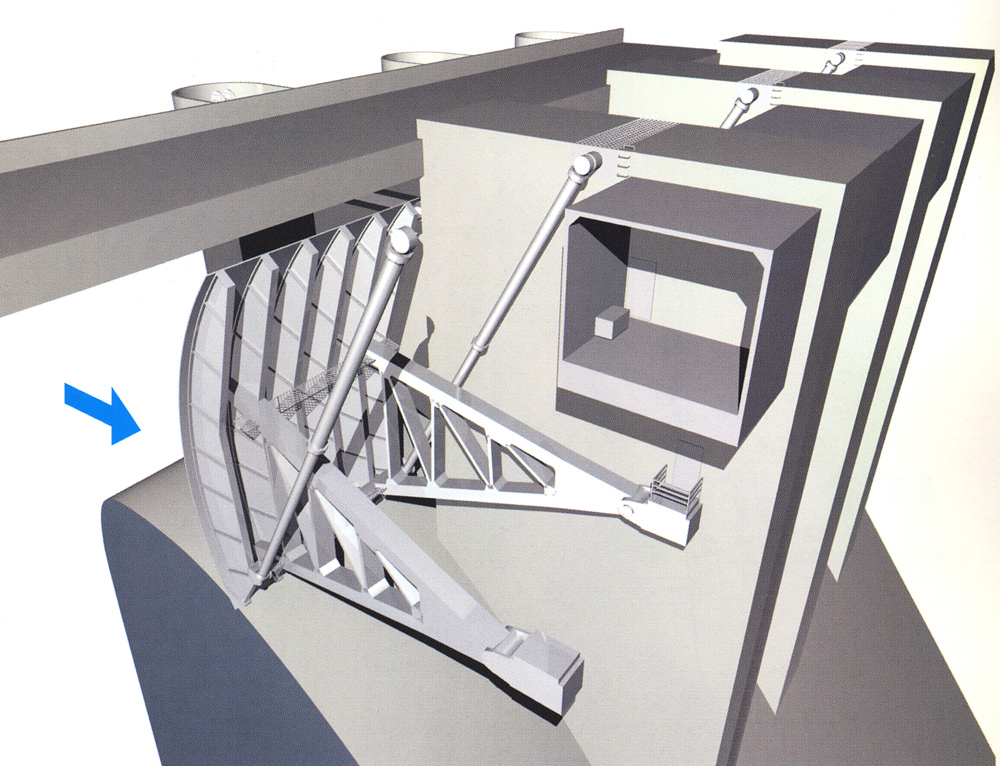 振動式油圧シリンダ式という構造を採用しています。開閉に使われる油圧シリンダーが扉体開度によって傾きを変えるためにこのように呼ばれます。