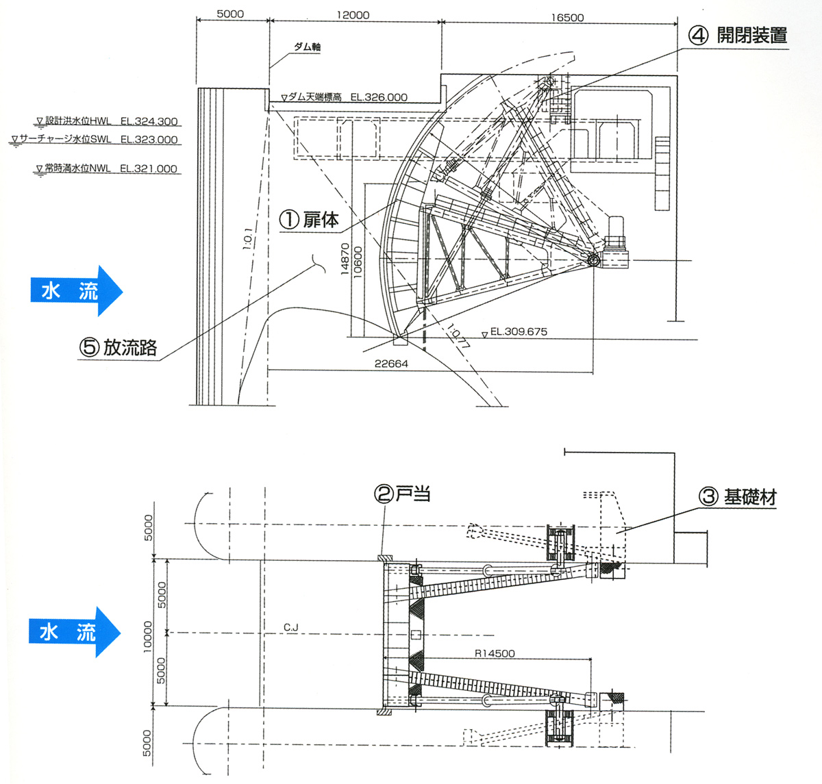 堤頂に突起物がなく景観上すっきりする、大型ゲートとして実績があるラジアルゲートを採用しています。