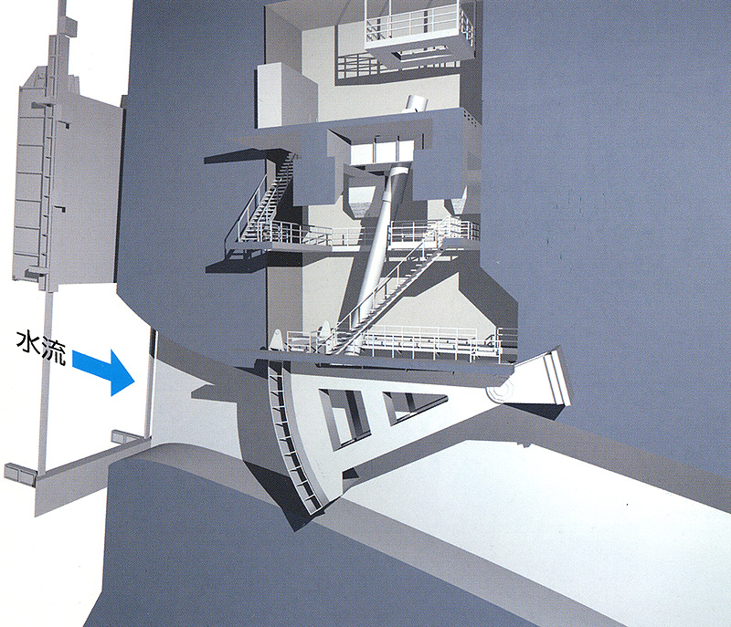 ダム本体上流面から、主ゲート(扉体)まで水を導きます。放流時に水流が剥離したり、キャビテーションを起こさないよう四面ベルマウス矩形断面という形状を採用しています。