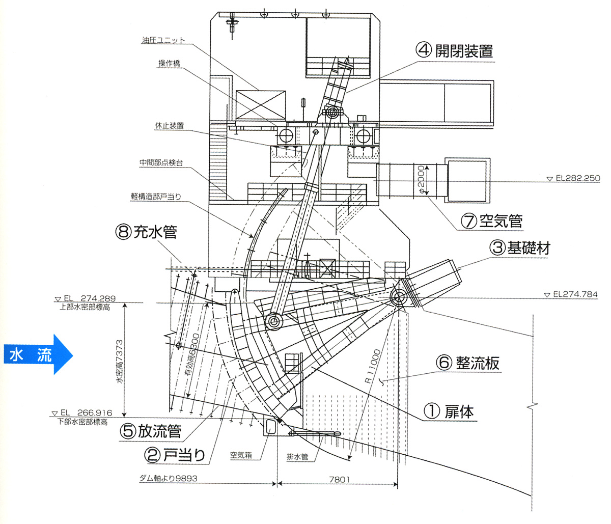 振動式油圧シリンダー式の構造を採用しています。開閉に使われる油圧シリンダーが扉体開度によって傾きを変えるため、このように呼ばれます。