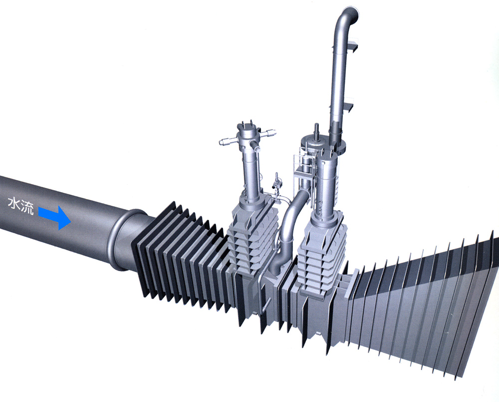 放流管が堤体外に露出することにより景観を損なわないよう、放流管は呑み口から放流口まで、全てダム堤体内に埋設されています。また空中放流による轟音、白濁を避け、限られたスペース内で水勢を落とすため、放流口は水中に設けられています。