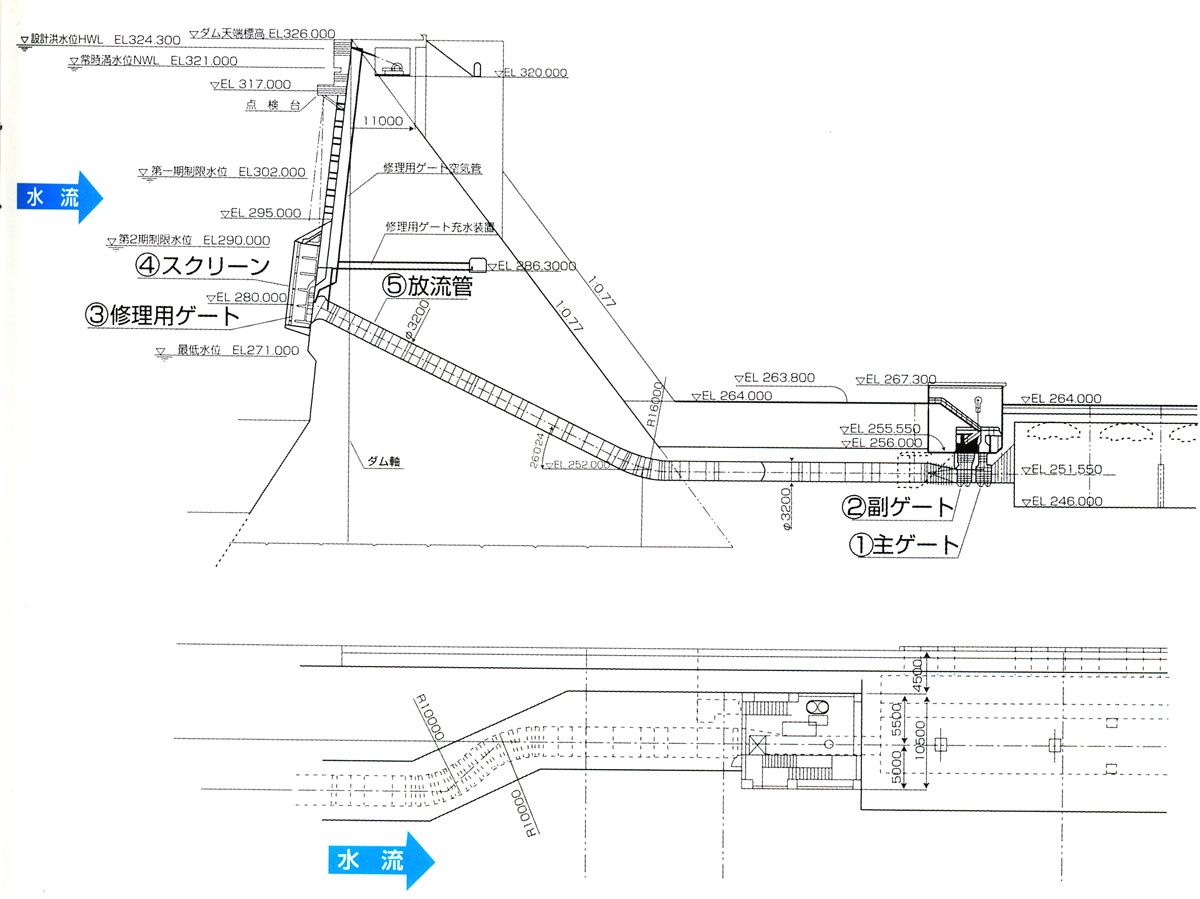 計画水位維持放流設備は、主に平水を上回る流入が生じた場合などにダム湖の水位を計画された所定の水位以下(平常時最高貯水位、第1期洪水貯留準備水位、第2期洪水貯留準備水位)に保つ設備です。