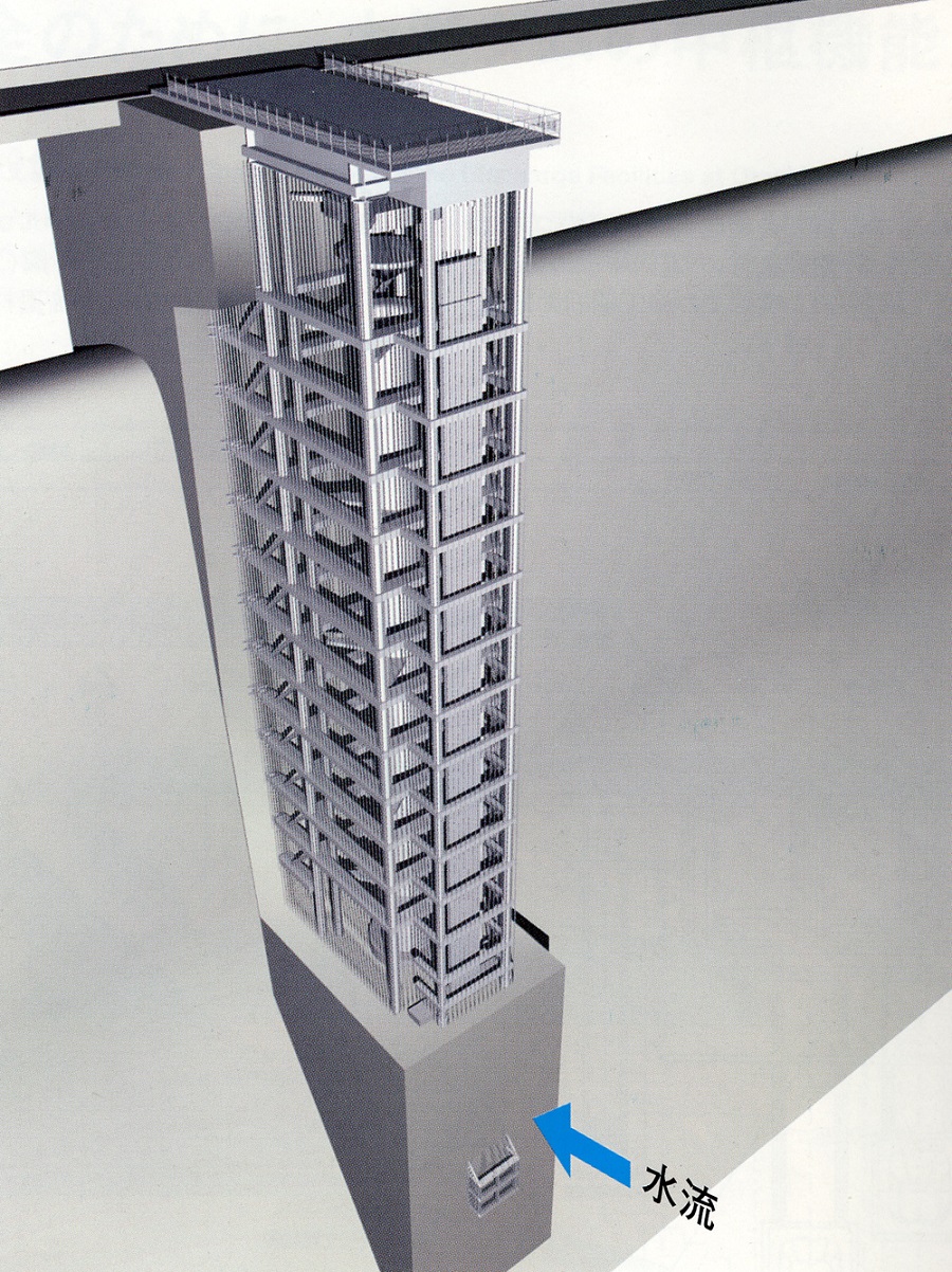 選択取水設備は、取水する深度を自由に選択する設備です。ダム湖など水深の深い湖では、その特性から温度躍層(水深の鉛直方向に水温が急激に変わる層のこと。浅いところでは水温が高く、深いところでは水温が低い)が初夏〜晩秋にできます。 選択取水設備は、平水時に下流へ放流する時に、可能なかぎり環境影響の少ない温度や濁度の水をダム湖から選択取水する役目を果たします。取水後は、利水放流設備や発電所を通じて放流することとなります。