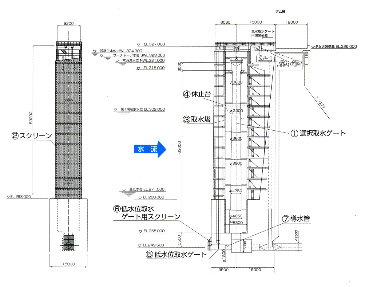 選択取水ゲートの取水範囲はEL.321(平常時最高貯水位)〜EL.271(最低水位)ですが、非常時に最低水位以下の水を取水するため、低水位取水ゲートが設置されています。