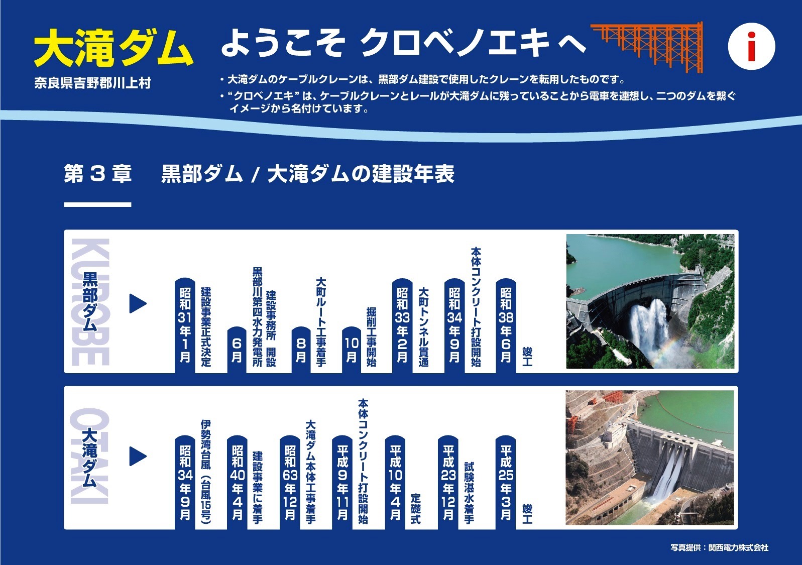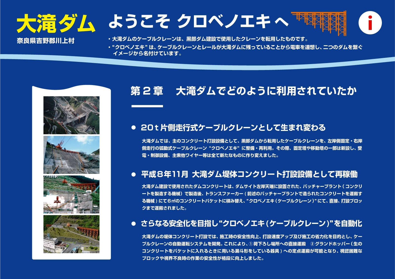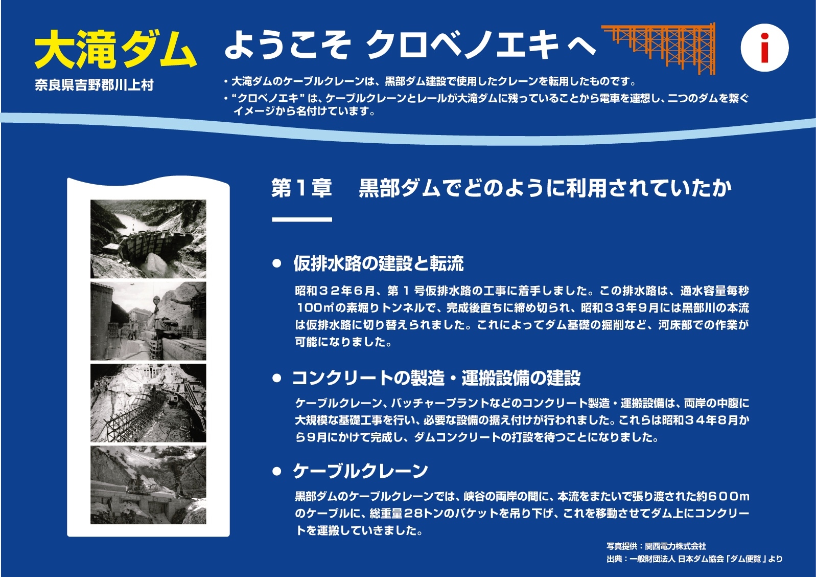 ケーブルクレーンとレールが大滝ダムに残っていることから駅を連想し“クロベノエキ”と名付けられました。