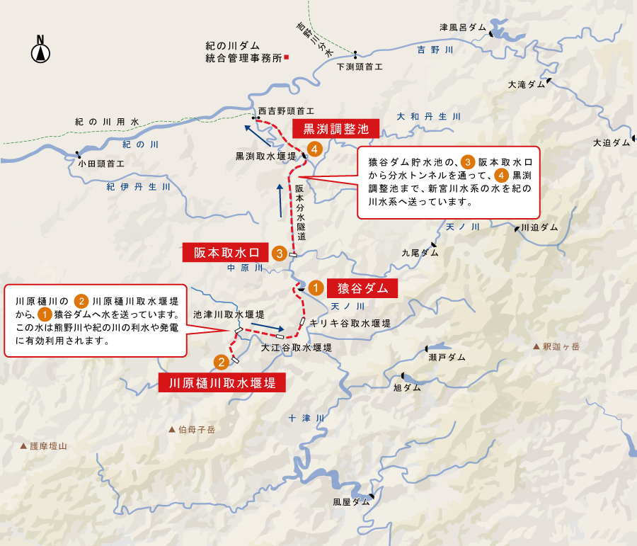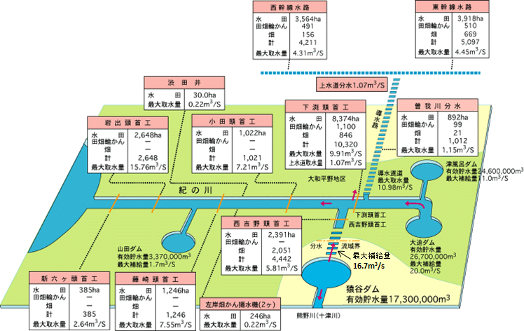 その主な内容は、比較的流況に余裕のある十津川に猿谷ダムを建設し、紀の川へと流域変更により分水を行い、さらに、吉野川(紀の川)上流に大迫ダムと津風呂ダム、紀の川下流支川の貴志川に山田ダムを建設し新たに水開発を行いました。