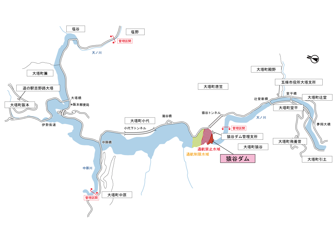 以下の貯水池平面図の赤色の斜線で囲まれた部分は、船舶の通航禁止区域となっております。 また、黄色の斜線で囲まれた部分は、船舶の通航制限区域となっており、 日の出から日没までの通航は可能ですが、速度2ノット以下で通航をお願いします。