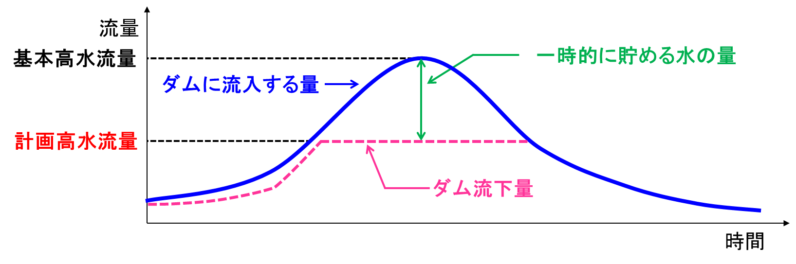 計画高水流量とは、ある川の流域に計画規模の雨が降った時に川に流れる流量(基本高水流量)のうち、ダムなどの洪水調節施設が「一時的に貯める水の量」を差し引いたものです。