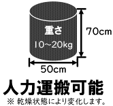 大きさは直径約50cm、高さ約70cm、重さは約10~20kgで、ビニールで巻いています。