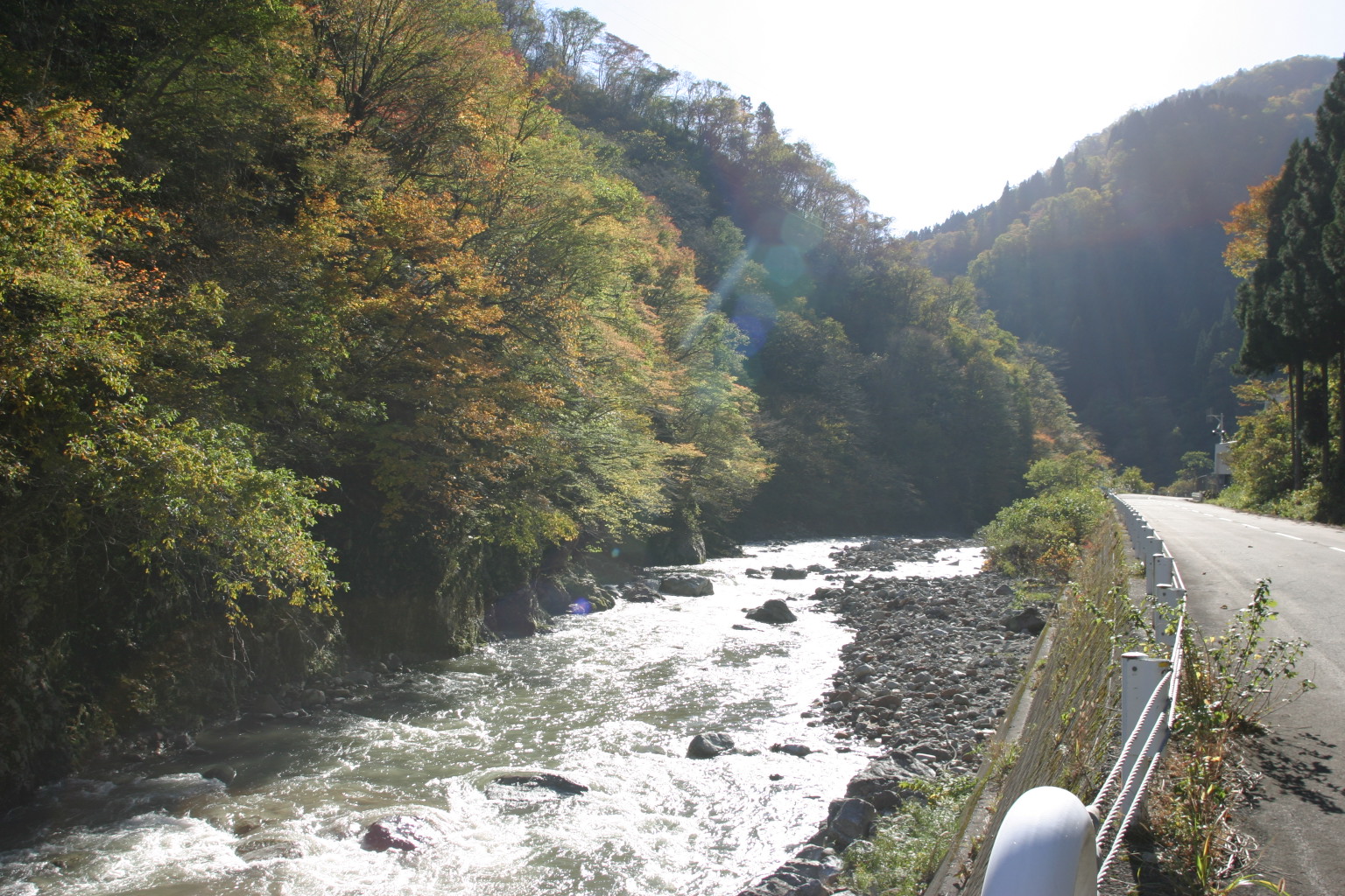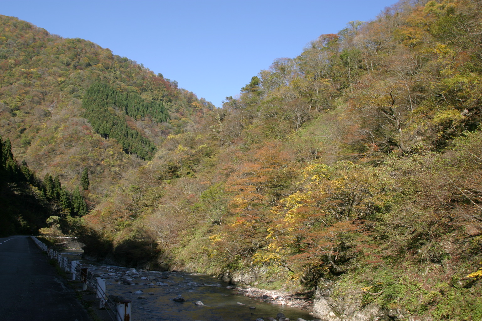 麻那姫湖(真名川ダム湖)周辺では落葉もちらほら見られ、紅葉の見頃も今週までではないかと思われます。 |
