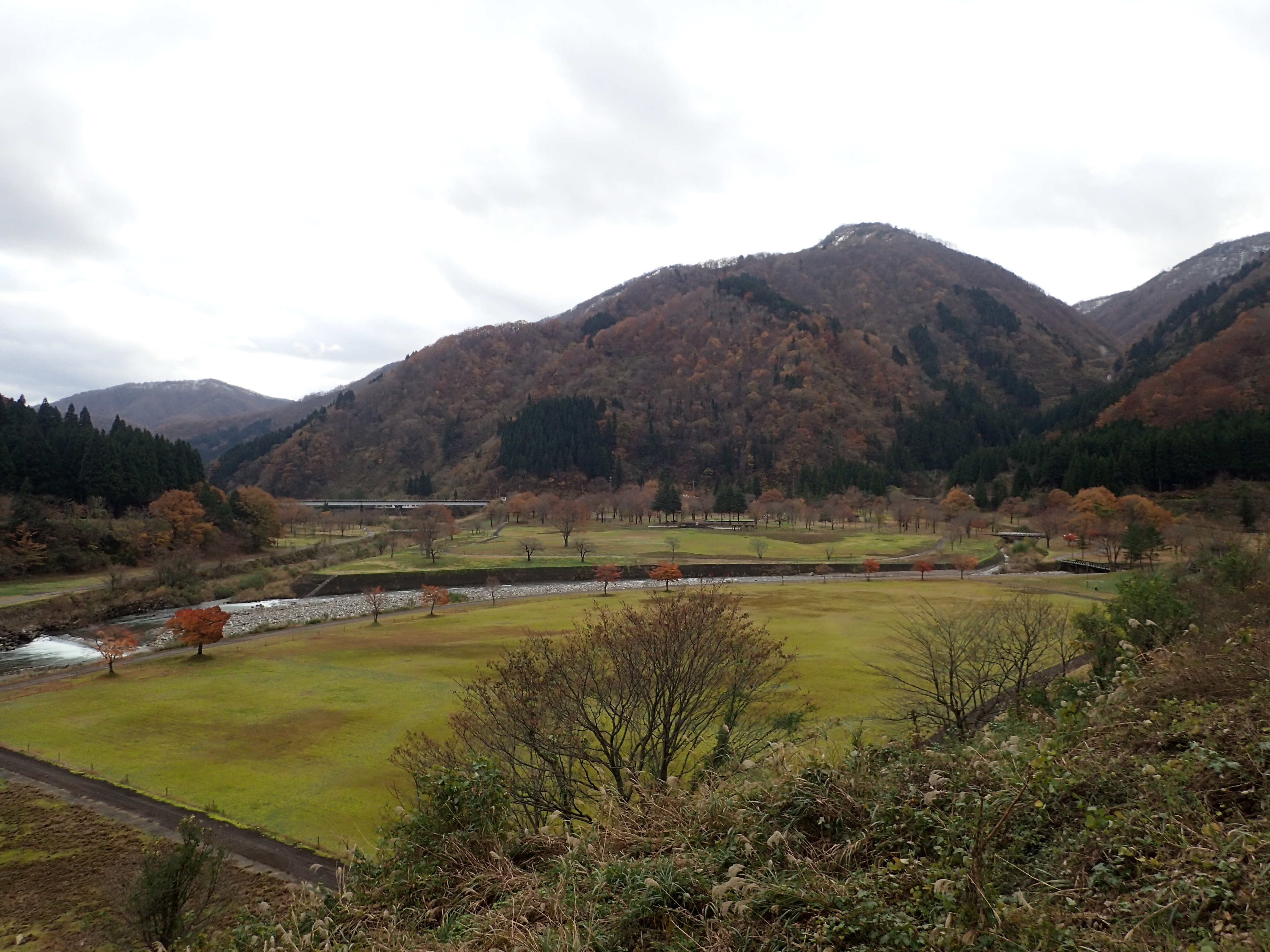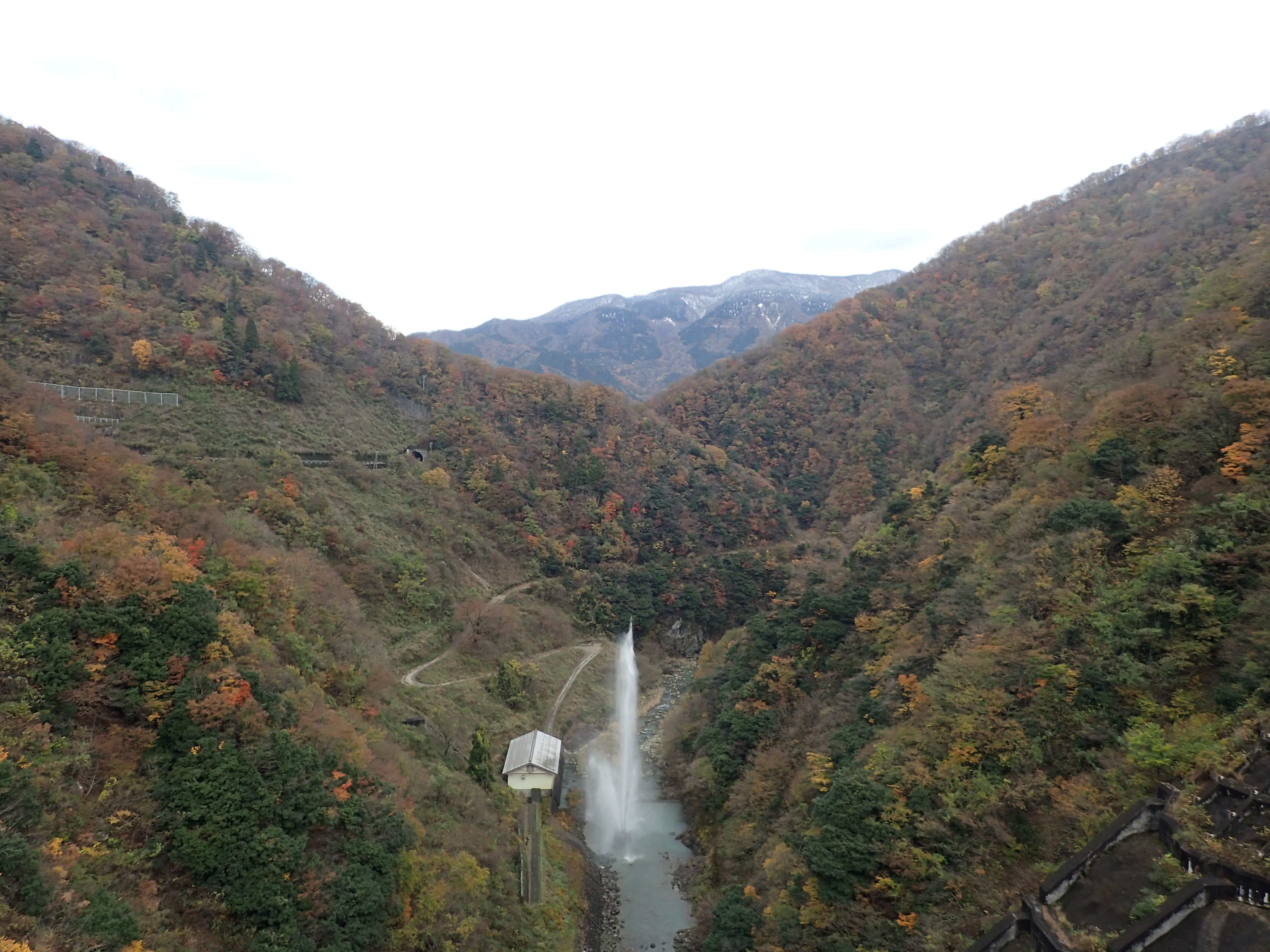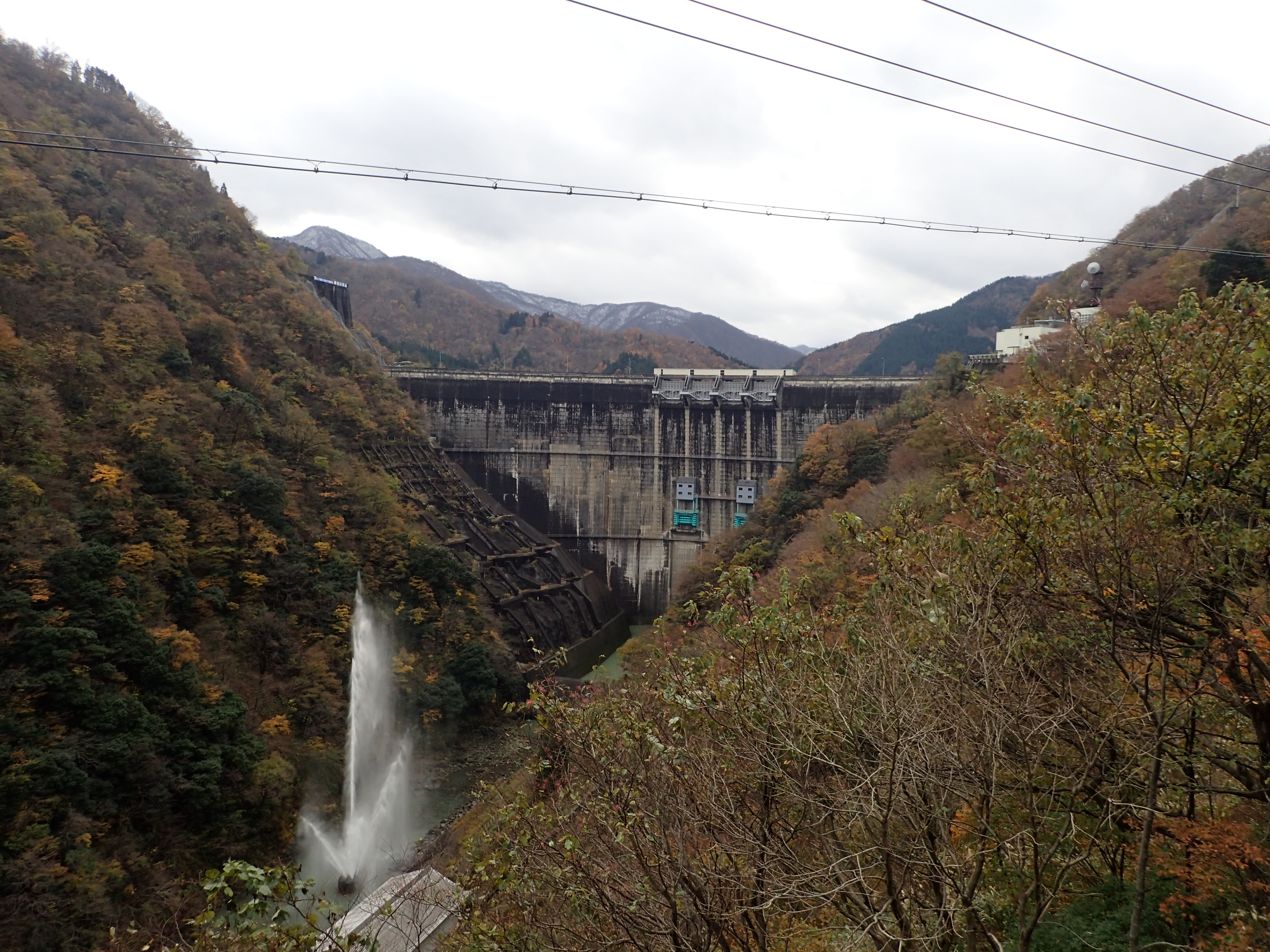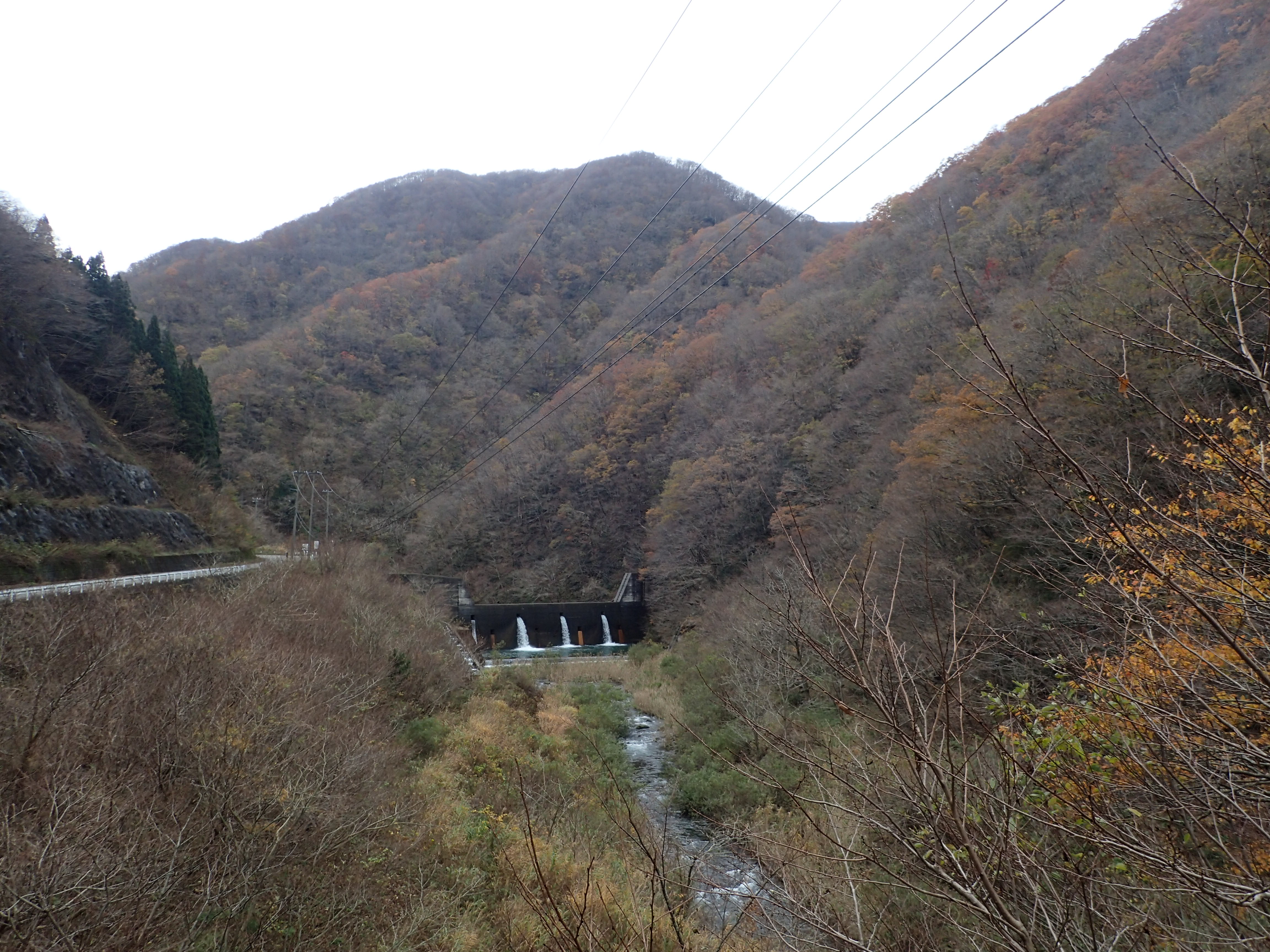 真名川ダム周辺の山の上部では降雪により白くなっており、紅葉シーズンも終りに近づいてきました。
