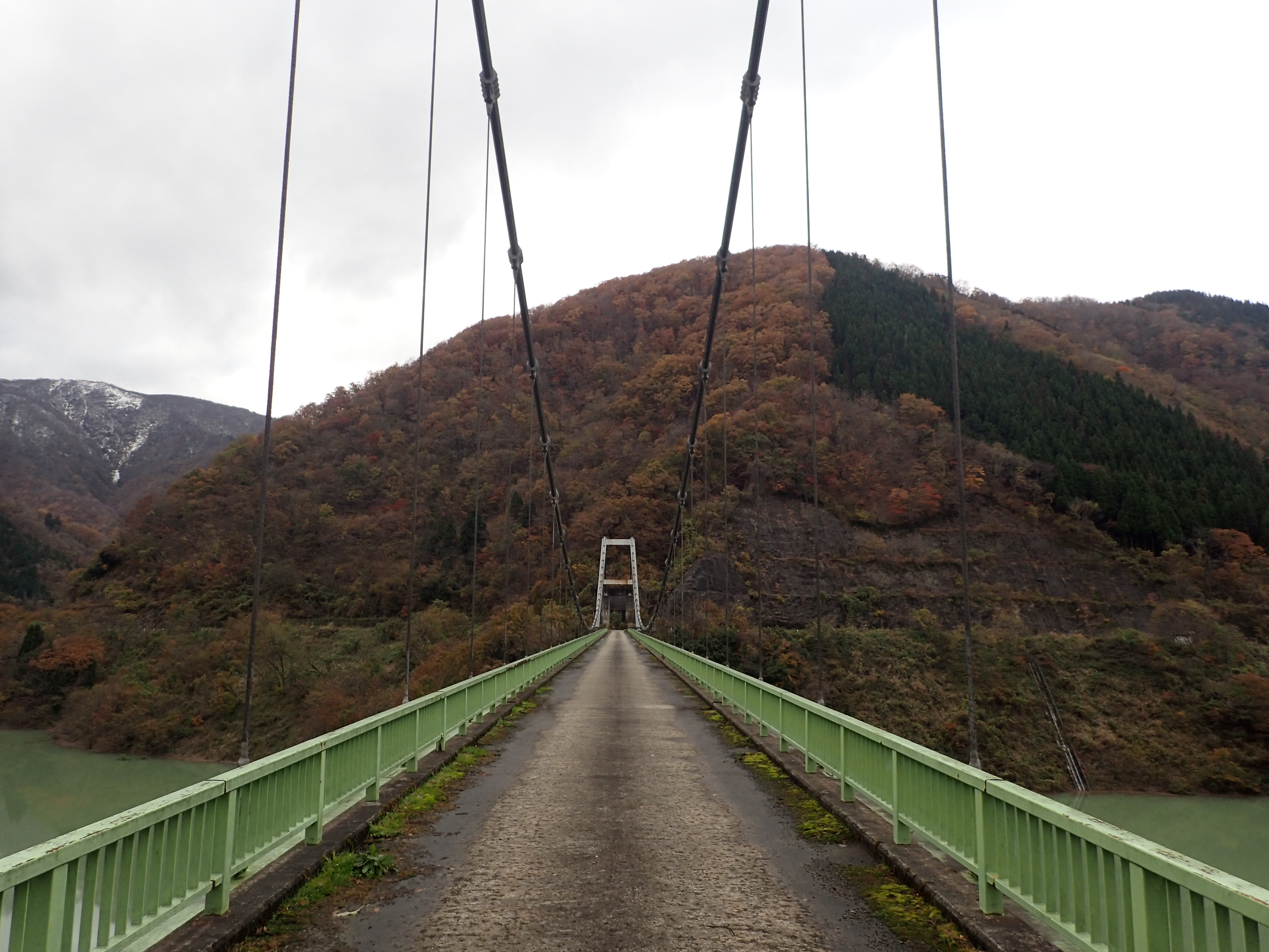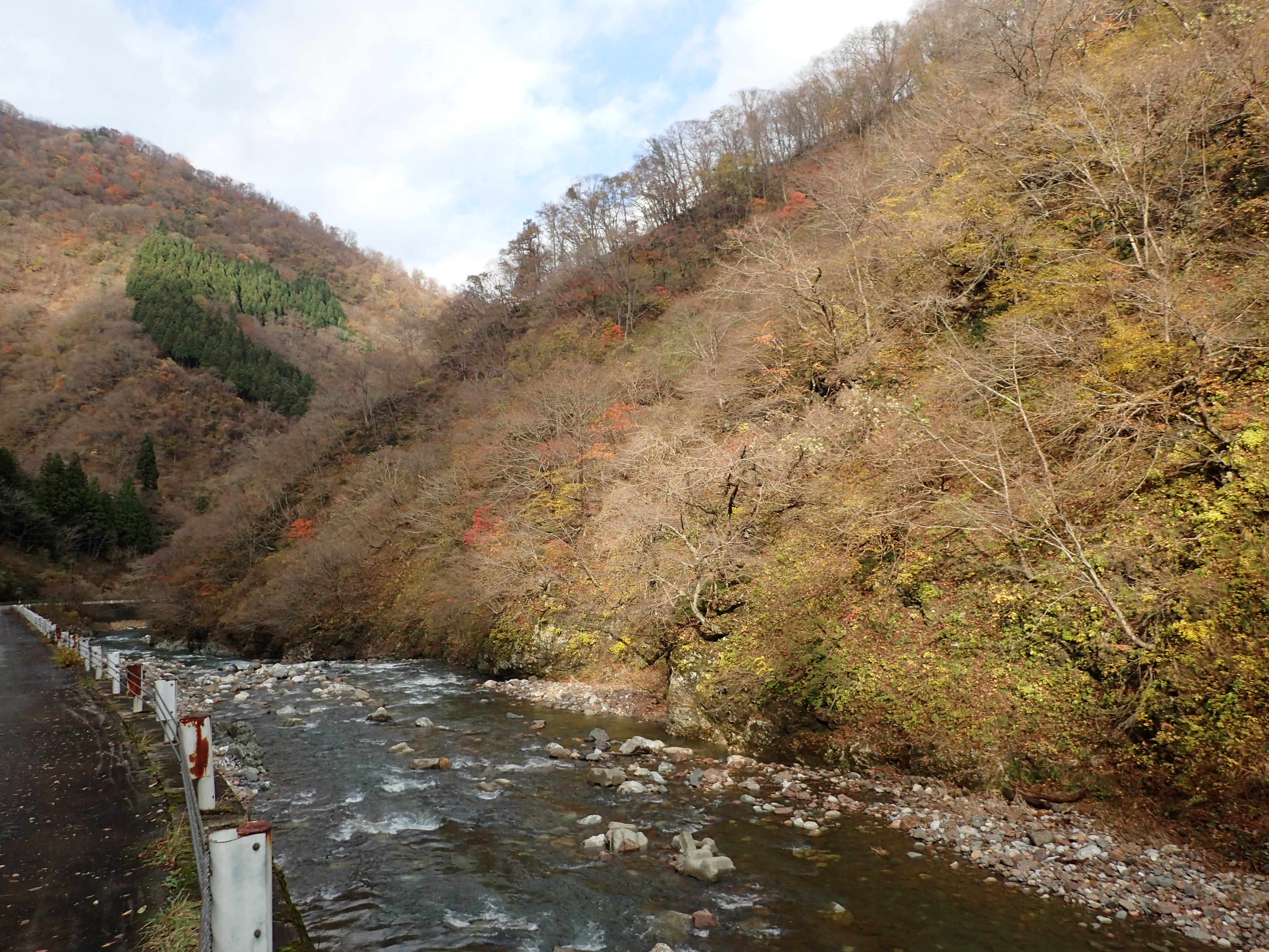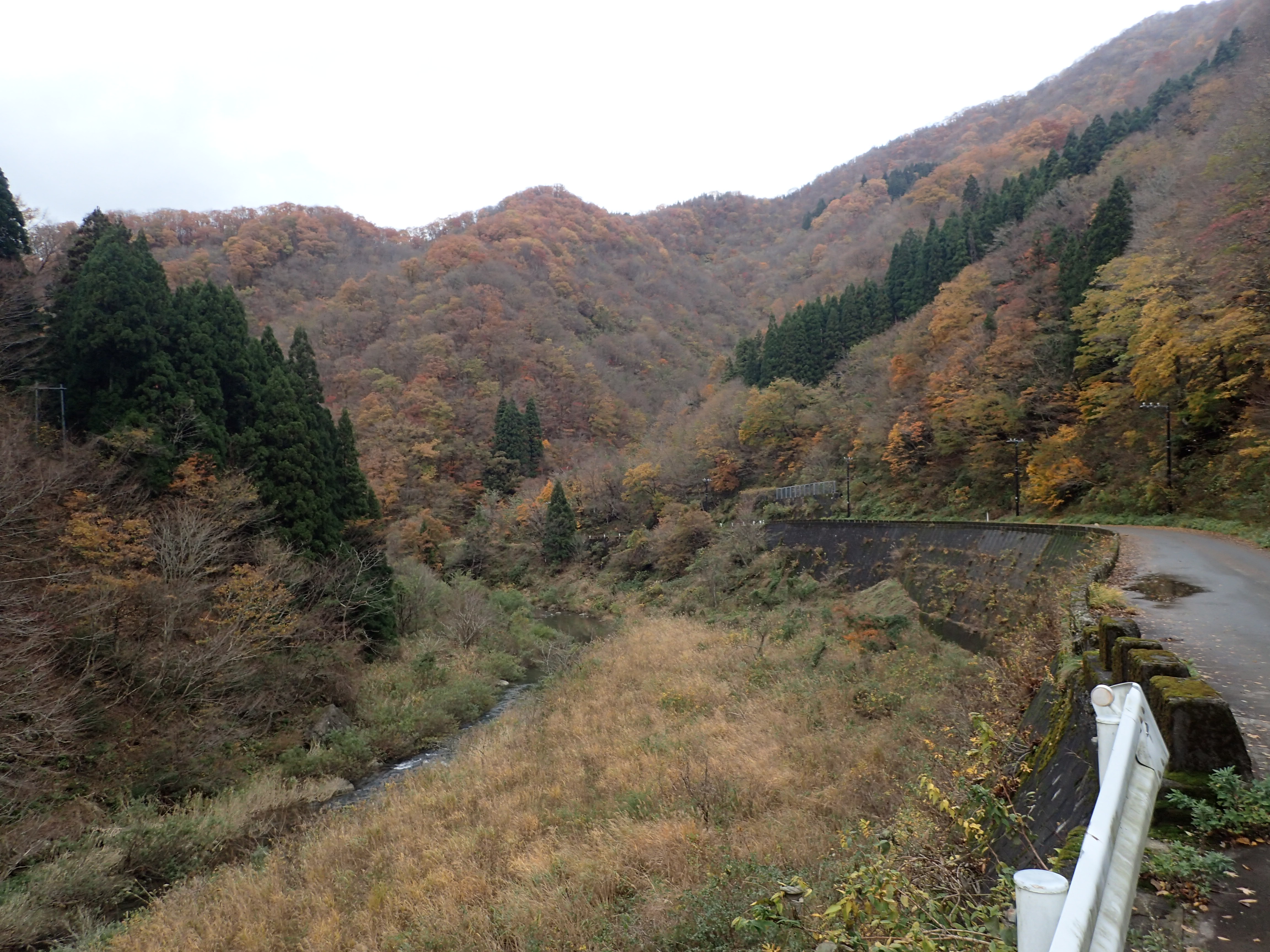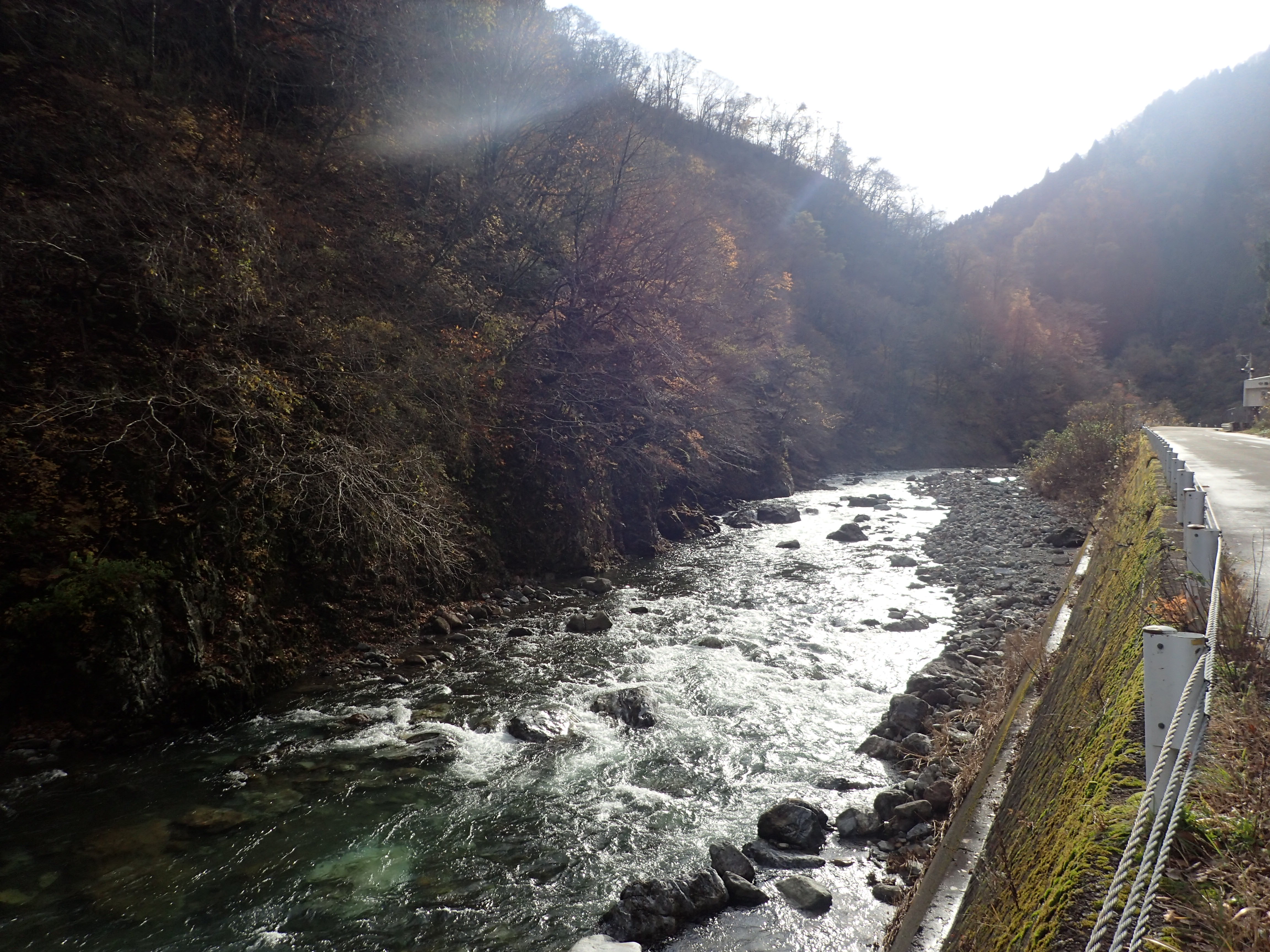 麻那姫湖(真名川ダム湖)周辺では落葉が進み、半分以上の葉が散った感じです。