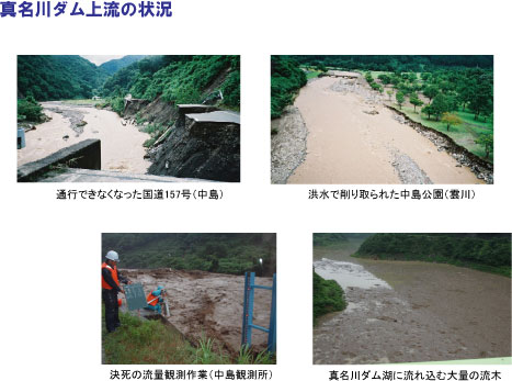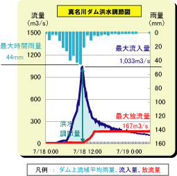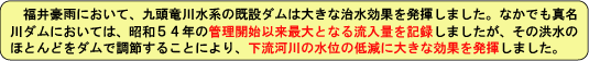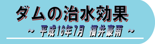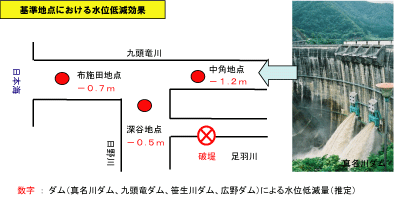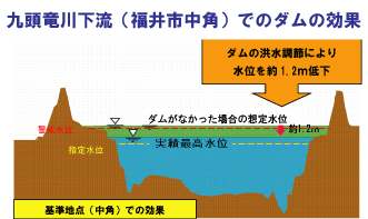 真名川ダム、九頭竜ダム、笹生川ダムの洪水調節により、中角地点で約1.2mの水位低減効果がありました。