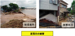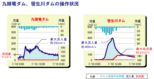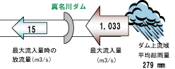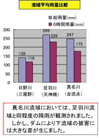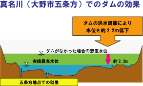真名川ダム、笹生川ダムの洪水調節により、五条方地点で約2.2mの水位低減効果がありました。