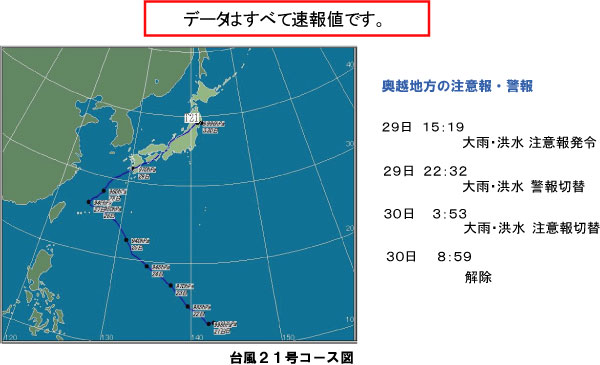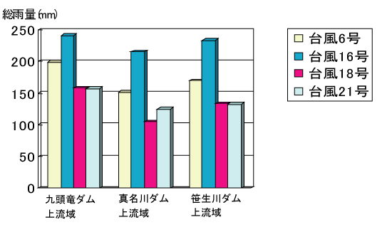 | 九州、四国、近畿地方を縦断した台風21号は、30日0時頃、福井県奥越地方に最も接近しました。 奥越地方では台風が接近した29日22時頃から強い雨が降り始め、九頭竜ダムの流域では、総雨量で約158mmの雨を観測しました。 九頭竜ダムでは、洪水調節を実施し、真名川ダム及び笹生川ダムと共に下流河川に対して治水効果を発揮しました。 |