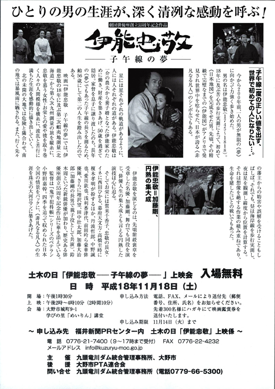 土木の日11月18日に、地域の暮らしを支える社会基盤をつくるために必要な土木技術の周知を目的として、歩行実測ではじめて日本地図を完成させた伊能忠敬の生涯をテーマとした映画「伊能忠敬 −子午線の夢−」の上映会を開催します。この開催にあたり先着300名、無料でご招待します。