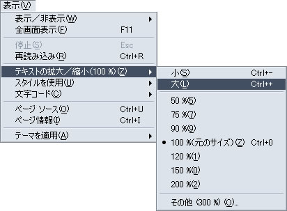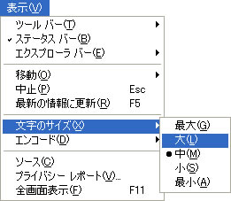一般的なWEBブラウザには、文字の表示サイズを変更することができるようになっています。当サイトの文字が読みづらい場合などは、下記の方法で文字のサイズを変更して調節してください。