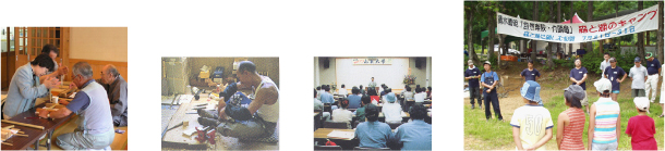 青葉の笛づくり/左 穴馬一刀彫/中左 山菜大学/中右 「九頭竜自然楽校」森と湖のキャンプ/右