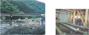 石徹白川での釣り/左 アマゴ・イワナの養殖(奥越漁協ふ化場)/右