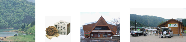 九頭竜湖/左 特産品(昇竜まいたけ)/中左 和泉ふれあい会館/中右 道の駅「九頭竜」/右