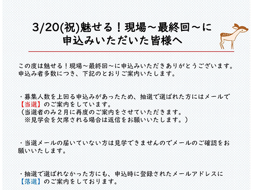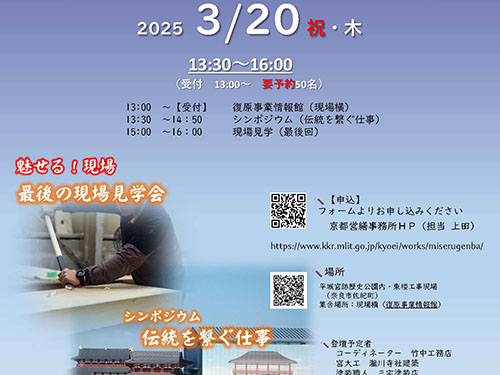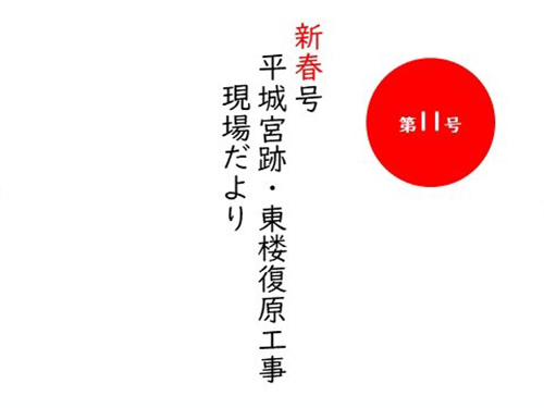 平城宮跡・東楼の復原工事に関係するご案内・ご紹介。現場の作業報告、見学会後の報告等を定期にお知らせします。 最新号 -特別号- 3/20魅せる!現場~最終回~へ申込みされた方へ ご案内 -30号- ~伝統技能工房めぐり~ 錺金具製作 バックナンバー -第29号- ~現場進捗~鴟尾が取り付きました! 魅せる現場見学会 -特別号- ~魅せる!現場 最終回~ 募集締め切りました -特別号- ~伝統技能工房めぐり~ 募集締め切りました -第28号- 魅せる現場見学会 大学生 高校生 (計121名参加) -第27号- 魅せる現場見学会・ミニガイドツアー (計90名参加) -第26号- ~伝統技能工房めぐり~ 古代瓦の製作 -第25号- 現場を支える人々 ~伝統を繋ぐ仕事~ -第24号- ~大好評!ミニガイドツア開催中ー~ (計17家族参加) -第23号- (投稿記事)文化財建造物保存技術協会 -第22号- 魅せる現場 イベントコラボ(ツバメのねぐら入り)他 (計42名参加) -特別号- 伝統技能工房めぐり(学生限定) 平城宮跡・東楼復原工事 -第21号- 魅せる現場 第16回見学会 (計23名参加) -第20号- 現場の今~(工事進捗報告)~ ~魅せる!現場~ -第19号- 魅せる現場 第14回・第15回見学会 (計37名参加) -第18号- 魅せる現場 第13回見学会 (計22名参加) -第17号- 魅せる現場 第12回見学会 (計32名参加) -第16号- 魅せる現場 第11回見学会 (計16名参加) -第15号- 魅せる現場 第10回見学会 (計60名参加) -令和5年度まとめ記事掲載- ~魅せる!現場~ -第14号- 現場を支える人々 ~伝統を繋ぐ~ -第13号- 平城宮跡 いち・に・さんぽ -第12号- 現場を支える人々 ~伝統を繋ぐ~ -新春号- 魅せる現場 第1~9回までのアンケート結果 (対象者218名) -第10号- 魅せる現場 第9回見学会 (小学生ら13名参加) -第9号- 魅せる現場 第8回見学会 (建設業関係者13名参加) -第8号- 魅せる現場 第7回見学会 (建設業関係者19名参加) -第7号- 魅せる現場 第6回見学会 (高校生55名参加) -第6号- 魅せる現場 第5回見学会 (建設業関係者25名参加) -第5号- 魅せる現場 第4回見学会 (建設業関係者13名参加) -第4号- 魅せる現場 第3回見学会 (建設業関係者23名参加) -第3号- 魅せる現場 第2回見学会 (大学生20名参加) -第2号- 魅せる現場 第1回見学会 (建設業関係者36名参加) -創刊号- ~奈良時代を今に感じる伝統技能の継承現場~