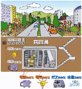 共同溝には、電気・電話・ガス・水道・下水道などが収められてます。じょうぶな鉄筋コンクリートでできていて、地震が発生したときもライフラインの被害が最小限ですみます。