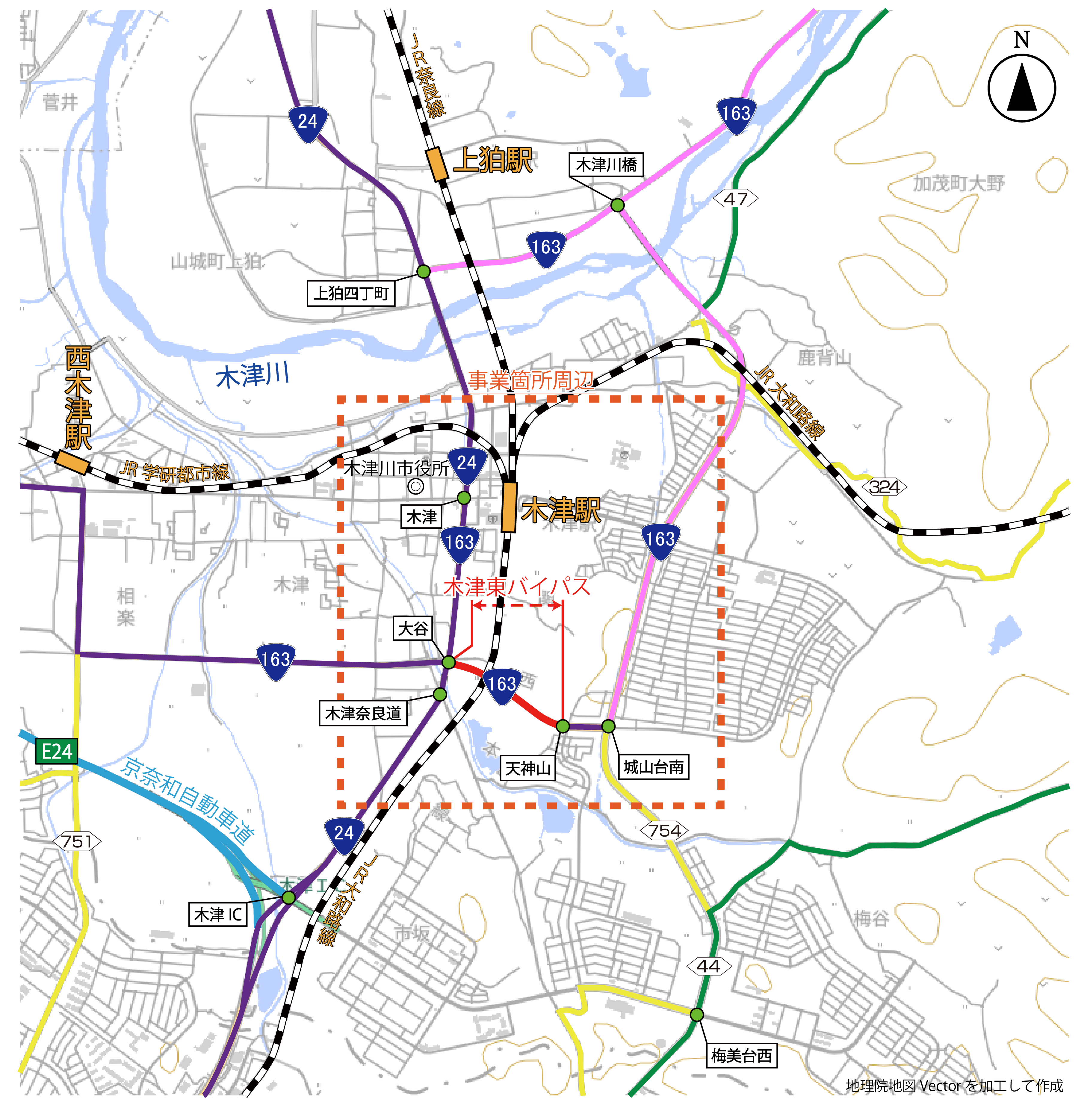 木津東バイパスは、京都府が整備する東中央線と一体となって新たなネットワークを形成することにより、木津川市内の中心地を通過する国道24号と国道163号の重複区間で発生している慢性的な交通渋滞を緩和するとともに、関西文化学術研究都市「木津中央地区」の開発や地域のまちづくりを支援することを目的とした、延長0.6kmのバイパス機能を果たす道路です。