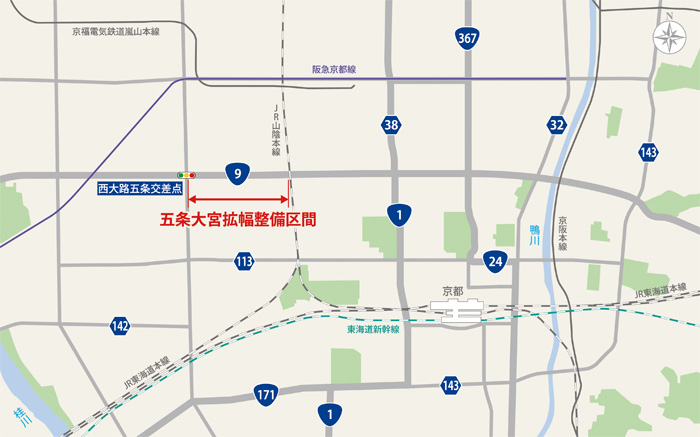 五条大宮拡幅は、このような国道9号の交通渋滞の緩和、沿道の環境改善や東大路・西大路間の五条通のシンボル化を目的に、JR山陰線丹波口駅から西大路五条交差点にかけての約0.9kmについて、4車線から8車線に道路拡幅を行う事業です。