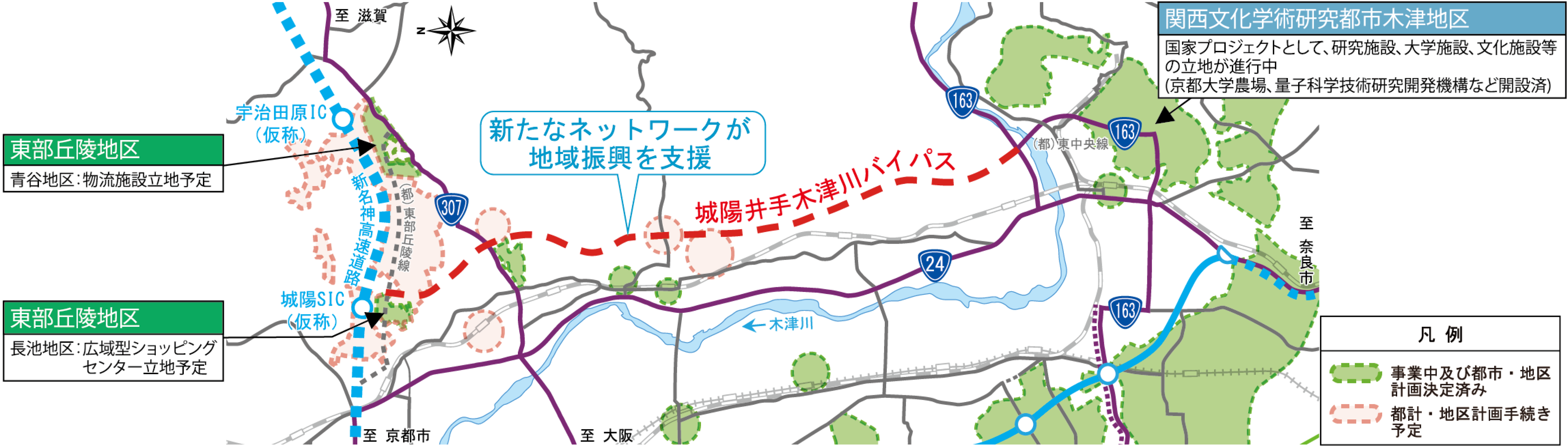 国道24号沿線では、東部丘陵地区や関西文化学術研究都市木津地区など多数の地域開発が展開されています。城陽井手木津川バイパスは開発地区や城陽SIC(仮称)へのアクセス道路として機能し、地域振興を支援します。