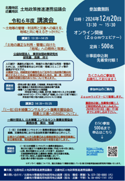 【講演会①(北陸地区土地政策推進連携協議会と共催)】 「令和6年度 講演会~土地等の管理・利活用と災害への備えを、地域と共に考えるきっかけに~」を北陸地区土地政策推進連携協議会と共同でオンライン開催し、約200名が参加しました。 【講演会②(近畿地区用地対策連絡協議会と共催)】 近畿地区用地対策連絡協議会と共同で、「近畿地区用地対策連絡協議会60周年記念講演」を開催し、約250名が参加しました。