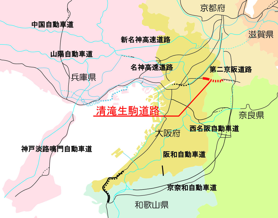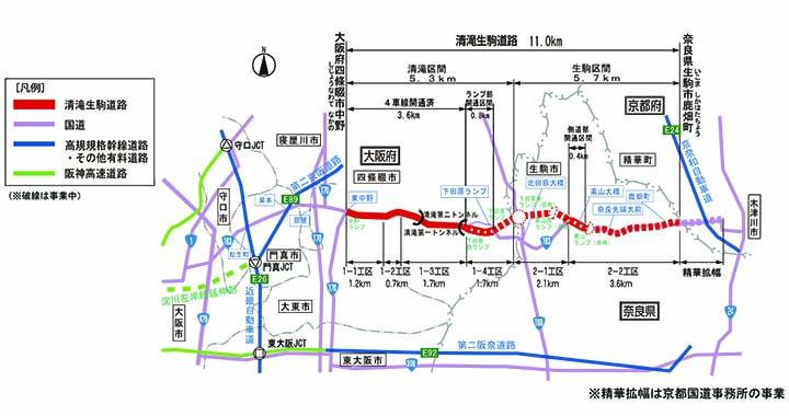 清滝生駒道路は、大阪市・大阪府東部・奈良県北部・京都府南部などを連絡する国道163号のうち、大阪府四條畷市中野から奈良県生駒市鹿畑町を結ぶ幹線道路であり、関西文化学術研究都市の開発などによる交通量の増加に伴う交通混雑の緩和及び交通安全の確保を目的とした大阪府域(清滝区間5.3km)、および奈良県域(生駒区間5.7km)延長11kmの道路です。