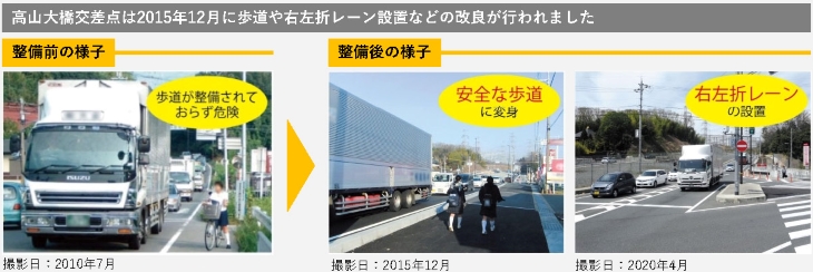 坂道やカーブが多く渋滞があると、ドライバーにとっては体力面でも、精神面でもストレスが大きいのですが、最近では高山大橋交差点も整備され、トラックのすぐ横を人が歩くこともなくなり、安心して走行できるようになったと感じています。