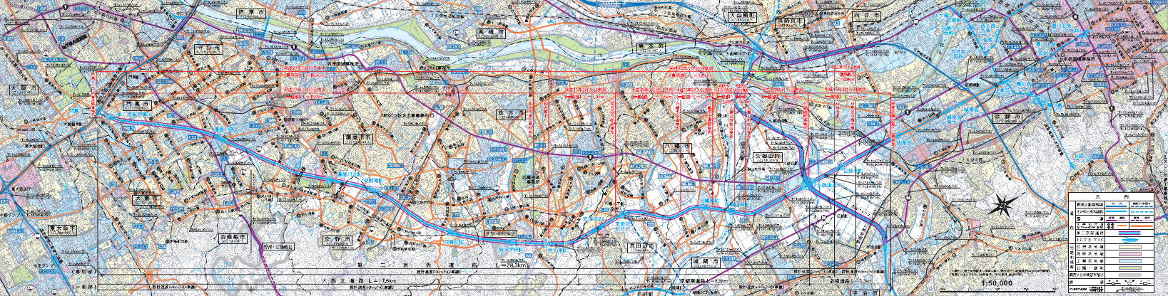 第二京阪道路は、京都と大阪を結ぶ延長約28.3kmの道路であり、国道1号の慢性的な渋滞の解消を目的とした4~6車線の自動車専用道路と2~4車線の一般道路からなる国道1号のバイパスです。本道路は環境や景観に配慮した道路となっています。具体的には、自動車専用道路の両脇に植栽帯、副道や自転車歩行者道からなる環境施設を設置し沿道環境への環境対策も行っています。