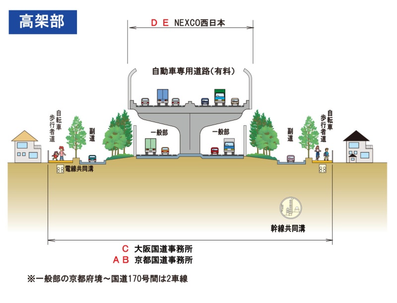 第二京阪道路 一般道路の大阪北道路(大阪府域)については大阪国道事務所、京都南道路・洛南道路(京都府域)については京都国道事務所が管理をしています。