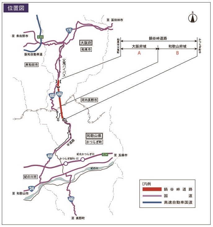 国道480号鍋谷峠道路の、大阪府域は大阪府鳳土木事務所、和歌山県域は和歌山県伊都振興局が管理しています。