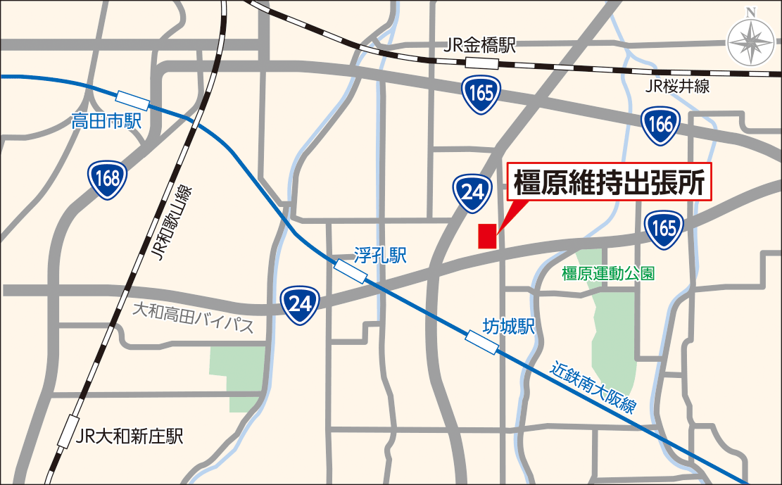 24号(大和御所道路・五條道路を含む)、25号(天理市内)、165号について、維持・管理を担当しています。 -