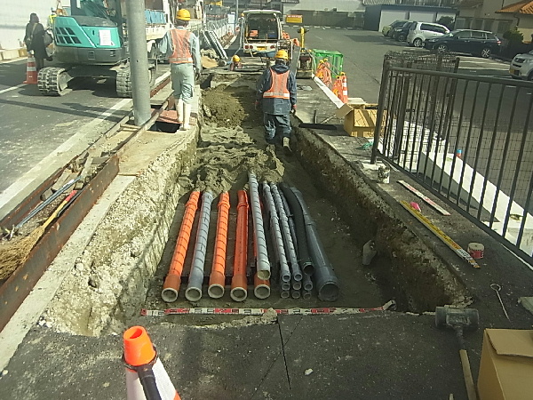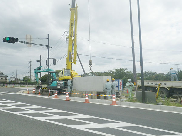 側道や歩道部分では、電線共同溝(電線の地中埋設)の整備に向けて、将来、電線の入線やメンテナンスを行うためのボックスを地中に設置しています。