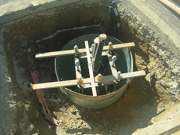照明の基礎は円柱状になっており、基礎の中には地下配管や照明柱を接続するための金具が設置されています。この中にコンクリートを打設します。