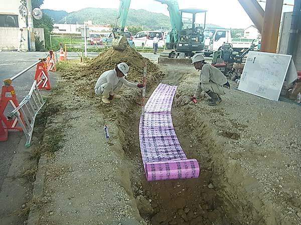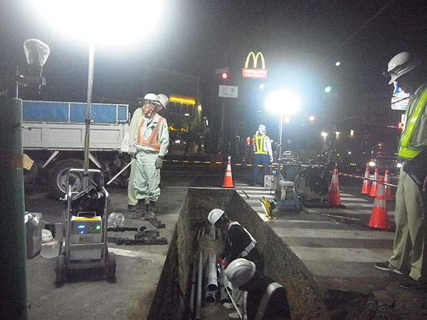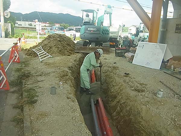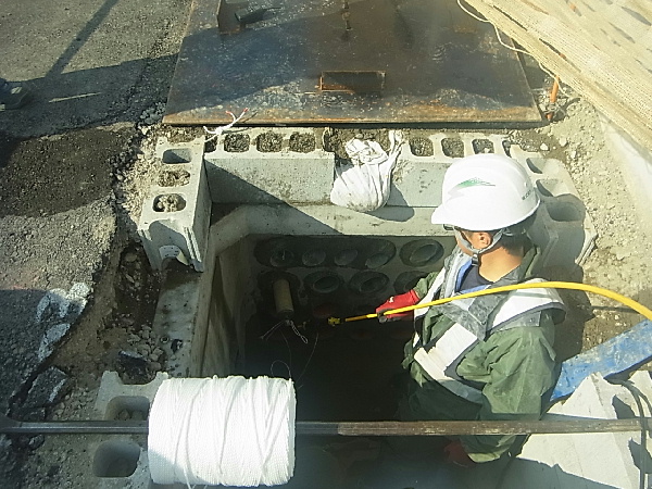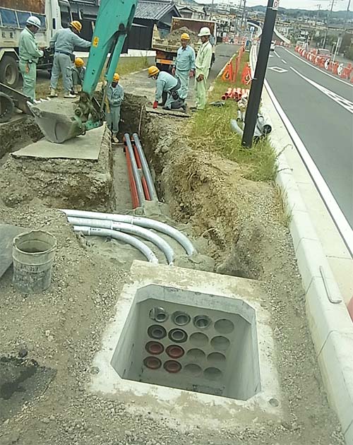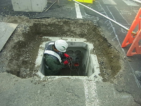 道路の地下に設置したボックスに電線共同溝の管路を接続しています。