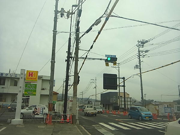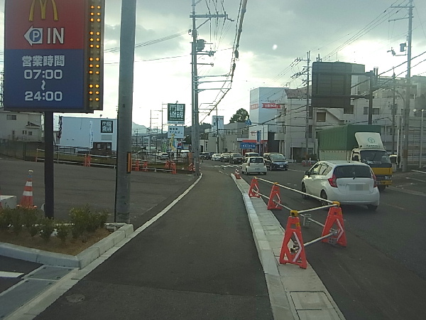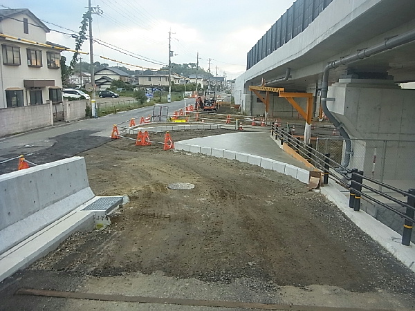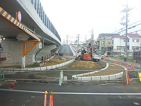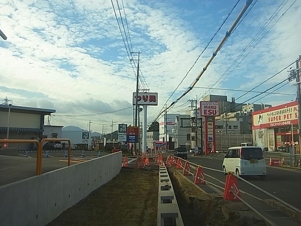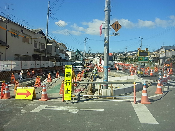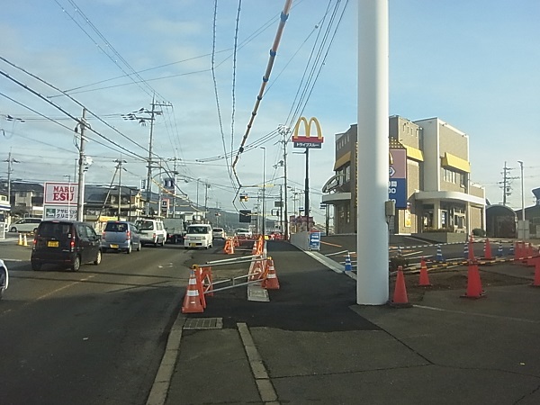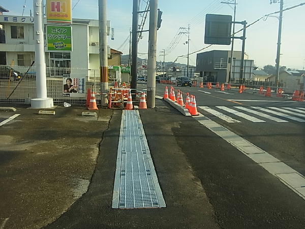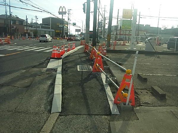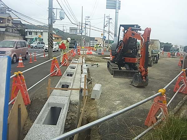 三室交差点の右折車線設置に向けて、国道25号の北東部で排水構造物や縁石を設置しています。