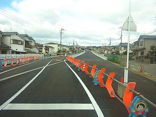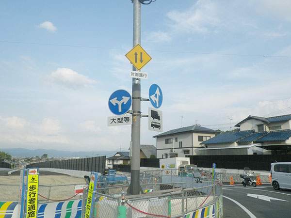 いかるがパークウェイの工事とあわせて、対面通行となっている迂回路の逆走対策について、警察と協議のうえ、走行方向を示す路面標示・警戒標識を設置しました。(令和元年7月17日設置)