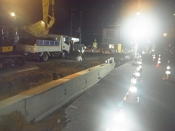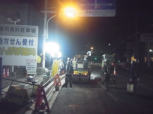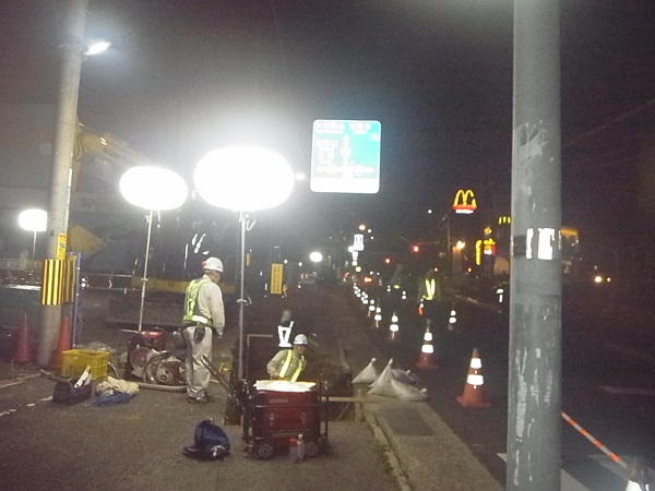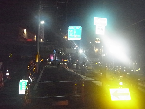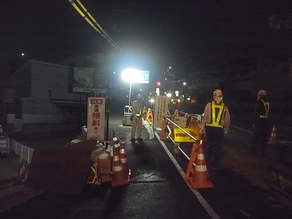 三室交差点の改良工事では夜間片側交互通行規制を行っています。