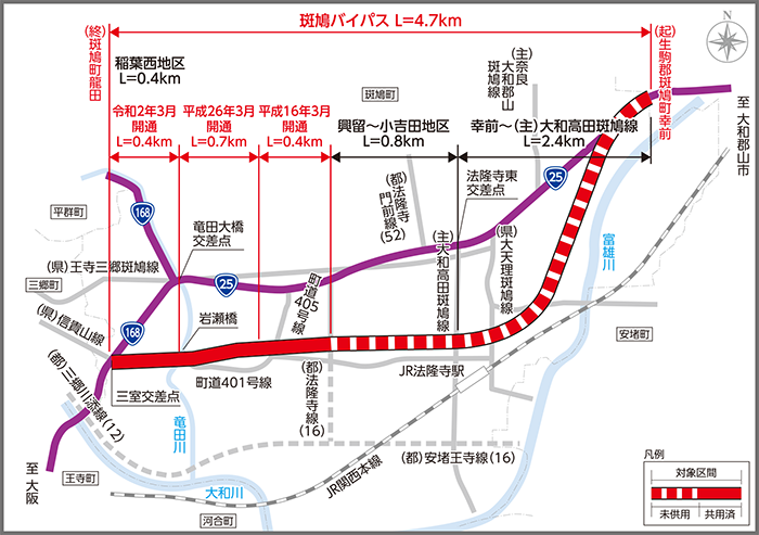 • 令和元年12月1日いかるがパークウェイ本線を暫定的に開通し、三室交差点と接続しました。同時に本線北側の町道の一部、南側の迂回路が一方通行になりました。