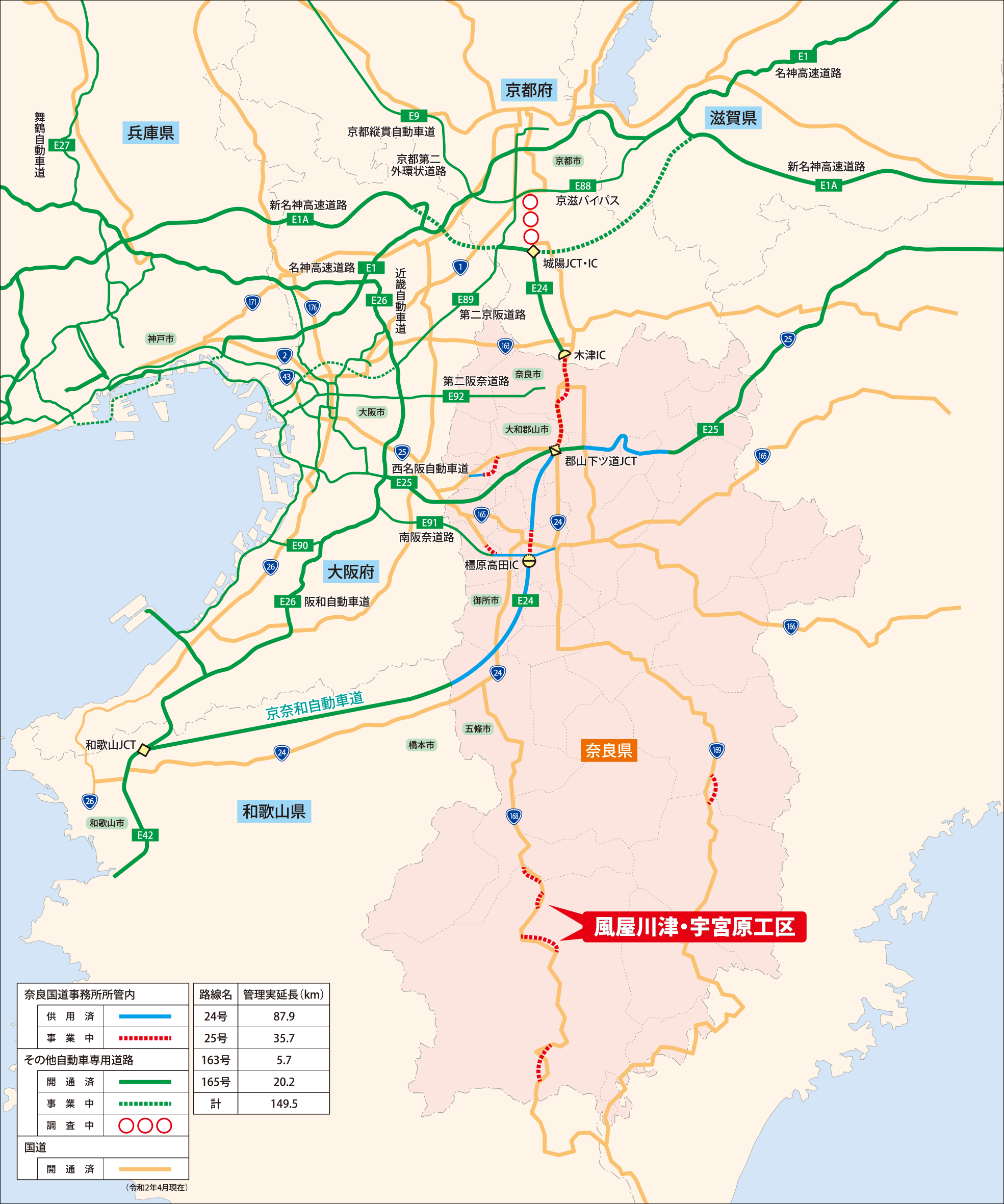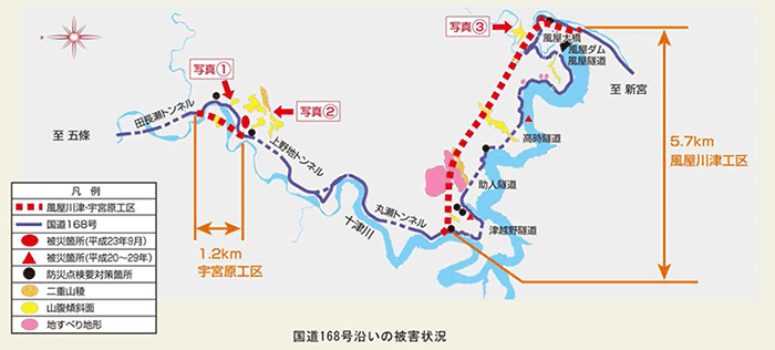 「五條新宮道路」の整備区間である五條市以南の国道168号は、急峻な地形条件のため、未改良区間(線形不良・狭小幅員)が多く、大部分が異常気象時通行規制区間となっているため、奈良県・和歌山県において順次整備を行っています。
