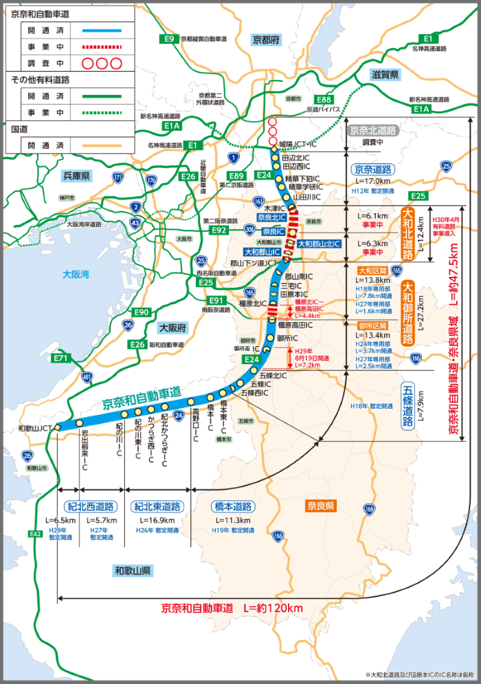 しかし、これらの地域には「古都京都の文化遺産」「古都奈良の文化財」「紀伊山地の霊場と参詣道」などをはじめとする世界文化遺産、国宝、重要文化財が数多くあり、また関西文化学術研究都市等の学術研究施設や高度な研究開発拠点があり大阪都市圏周辺には、固有の歴史・文化に裏打ちされた貴重な地域資源が数多く存在しています。こうした地域資源を有機的ネットワークで形成し、これからの近畿の経済・文化・暮らしを支えるのが、現在事業が進められている京奈和自動車道です。