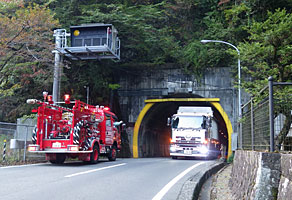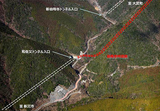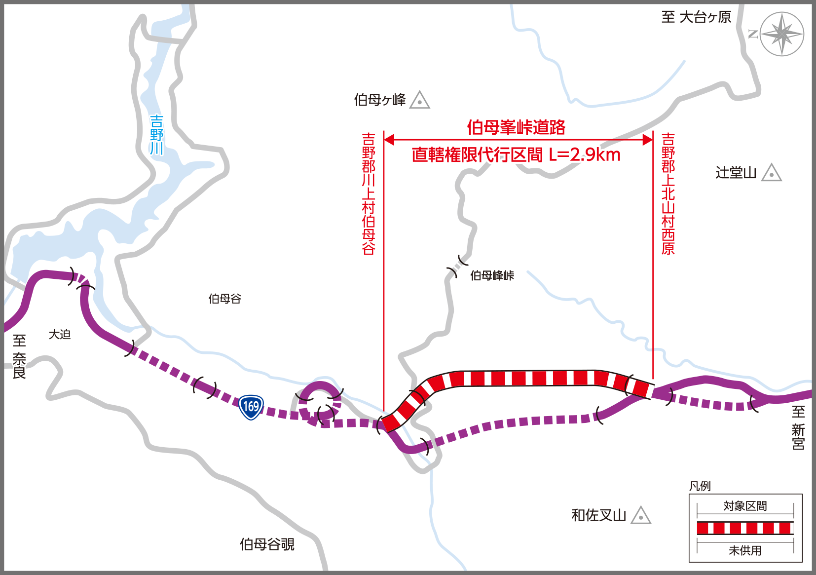 国道169号の中央部に位置する新伯母峯トンネルは、老朽化が進むとともに、建築限界未確保のために 大型車同士のすれ違いが困難で利便性・通行性の面で問題を有しています。 また、新伯母峯トンネル近傍の斜面では防災点検要対策箇所もあります。