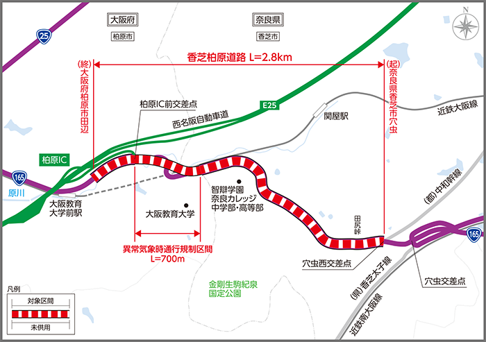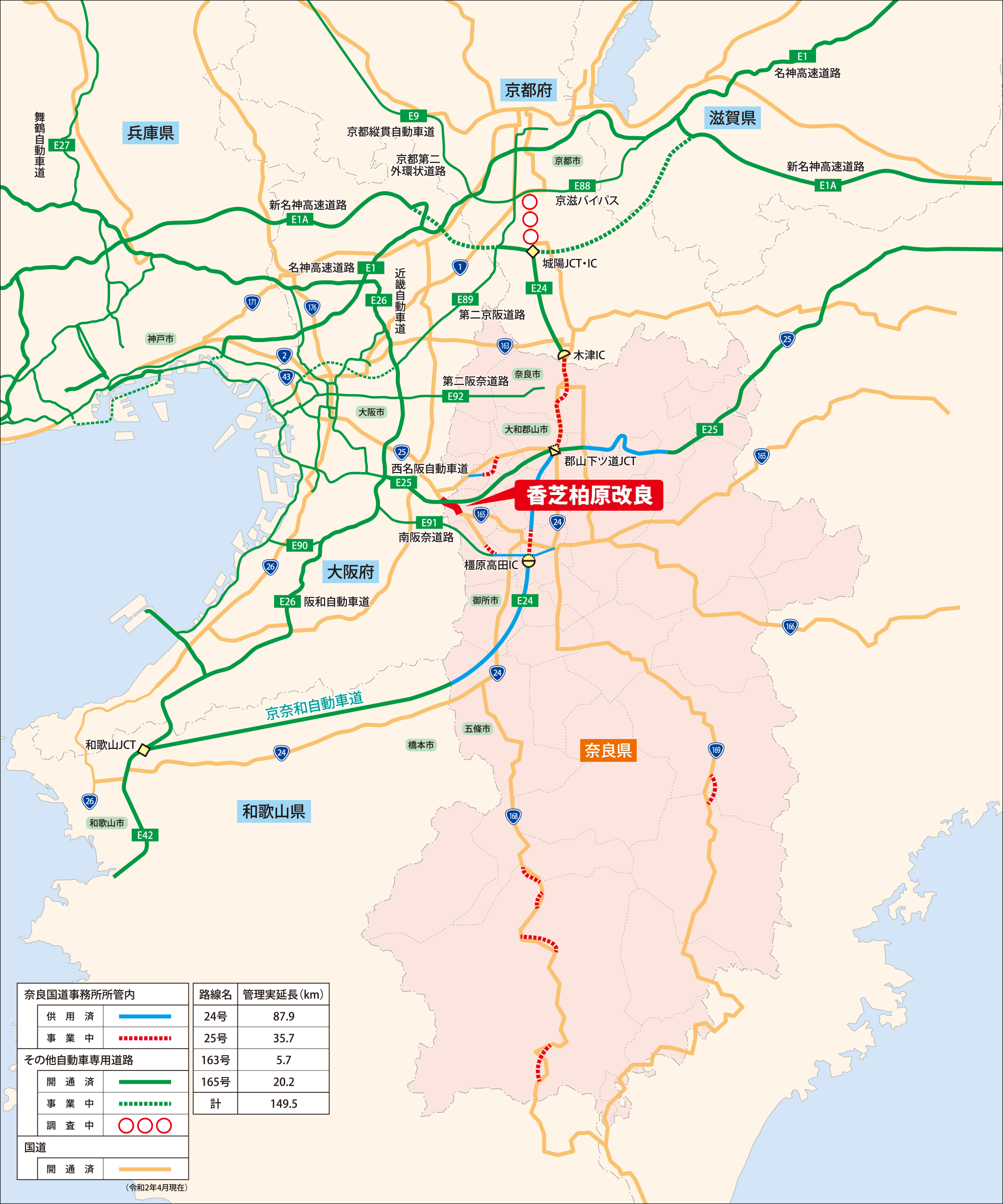 香芝柏原改良は、国道165号の奈良県香芝市穴虫~大阪府柏原市田辺までの2.8kmの道路改良です。この区間の連続する急カーブをなくし、車線数を2車線から4車線に増やすことで、国道165号大和高田バイパス、中和幹線から集中する交通を円滑に処理するとともに、西名阪自動車道へのアクセス性を高め、さらには、地域間の交流促進が図れることが期待されています。また、奈良・大阪府県境付近の異常気象時通行規制区間の解消や自転車歩行者道の設置により、安全な道路へ生まれ変わります。